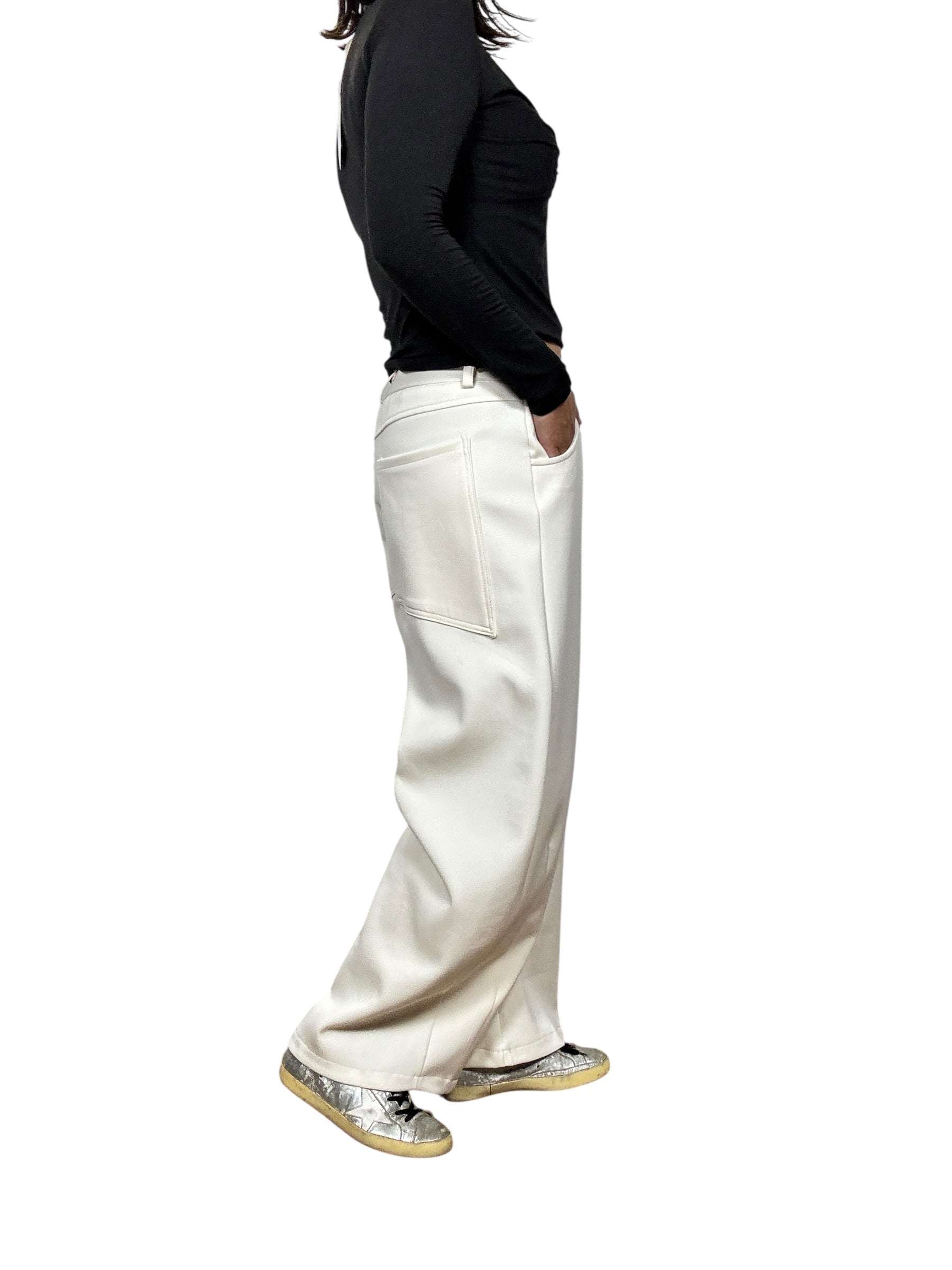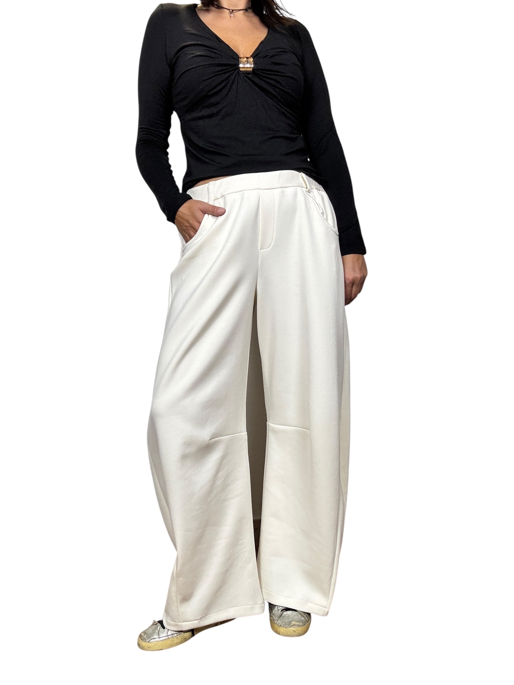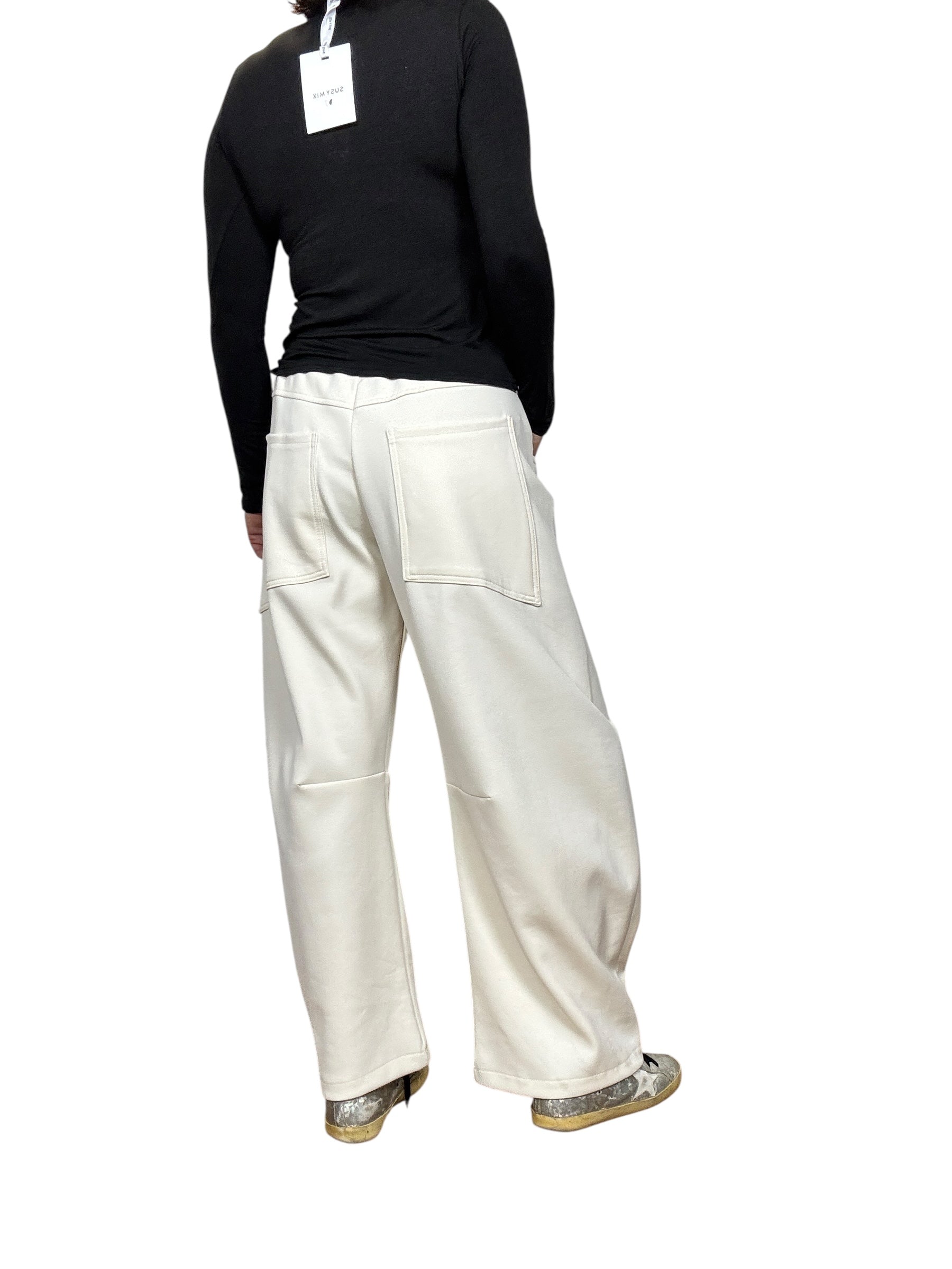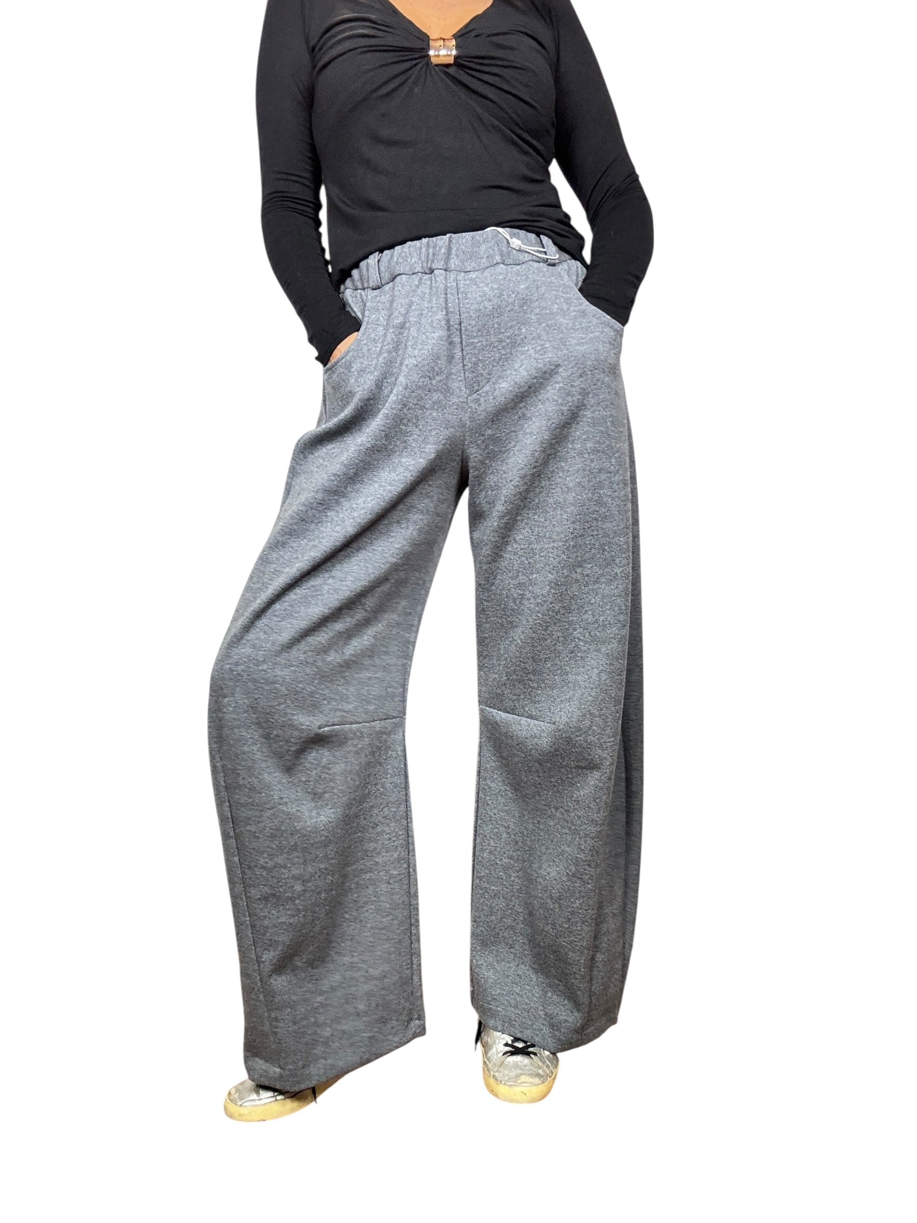 Pantalone a vita alta con elastico in cintura e tasche laterali + posteriori. Modello baloon con gamba ampia e morbida che va a chiudersi in caviglia. Tessuto elasticizzato (veste grande)
