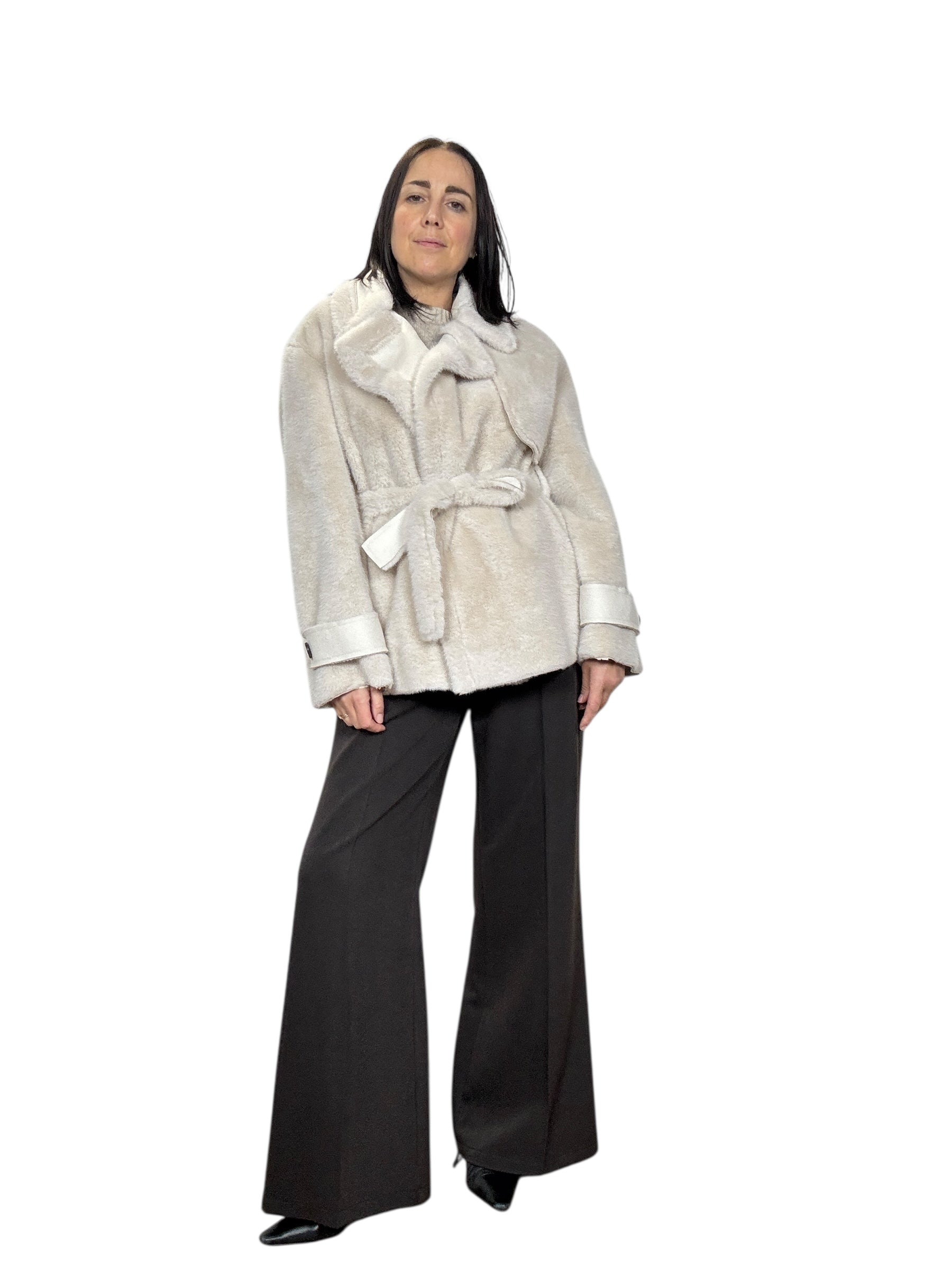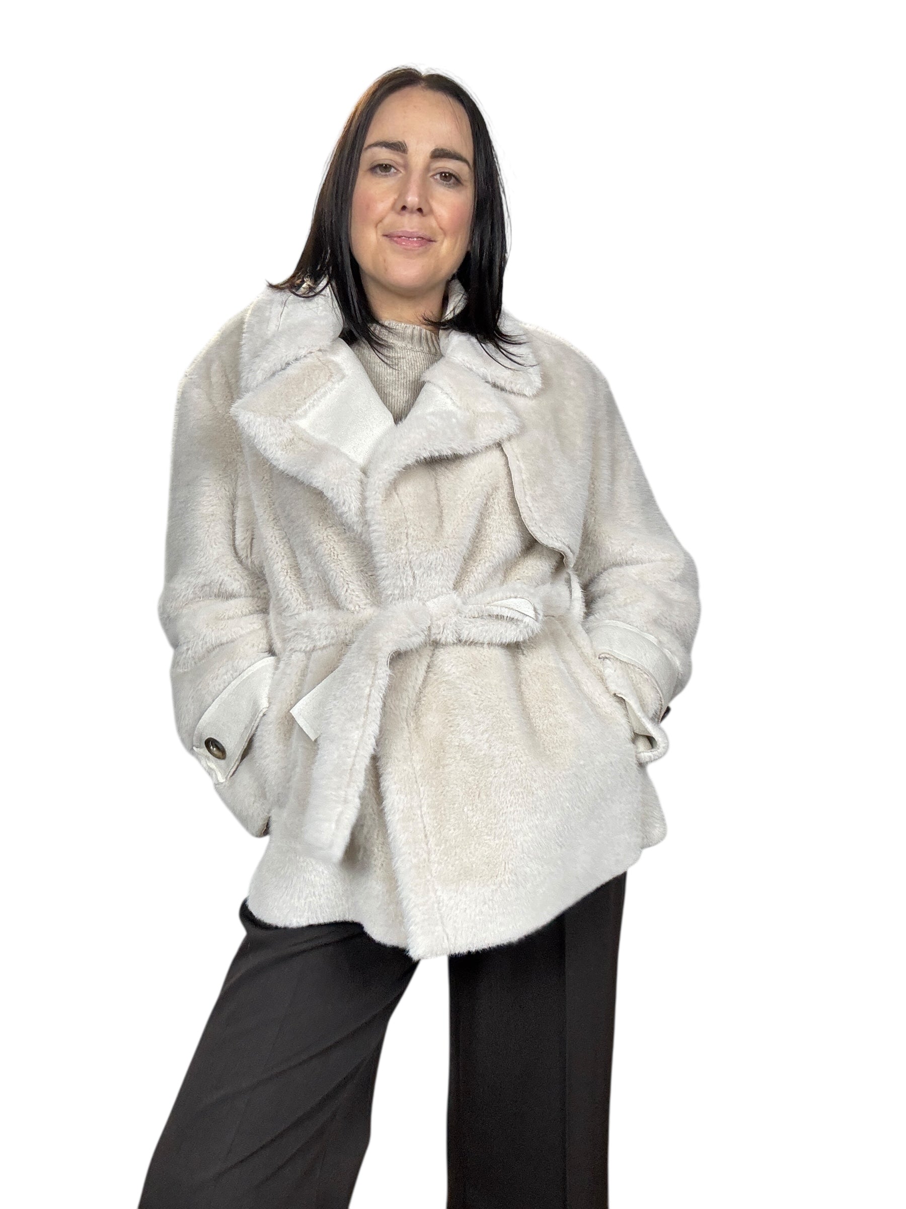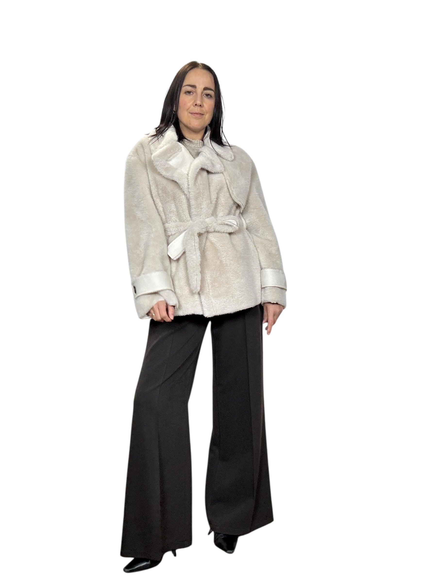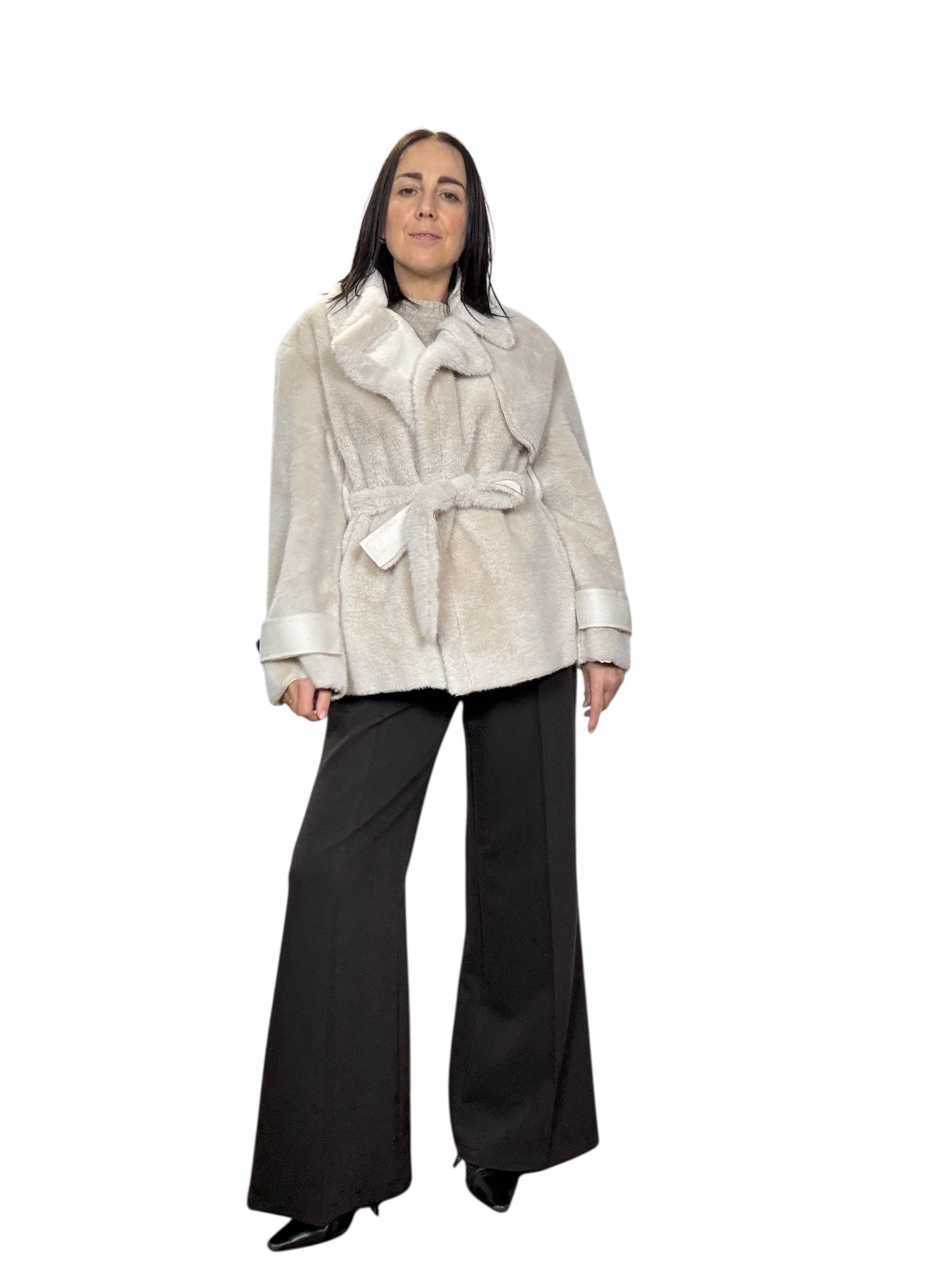 Pelliccia con interno in ecomontone e cintura in vita che consente di portarla chiusa e sfiancata