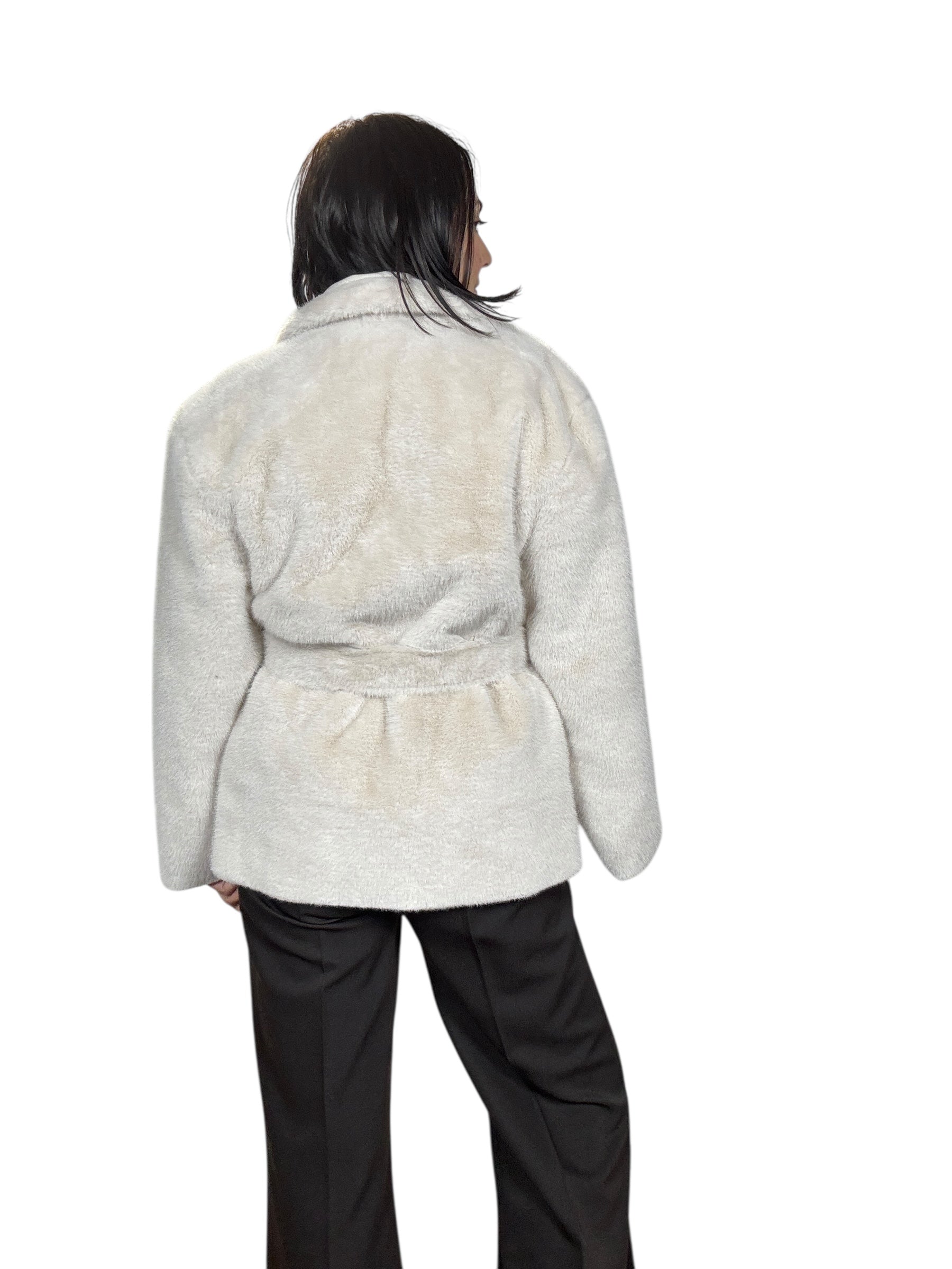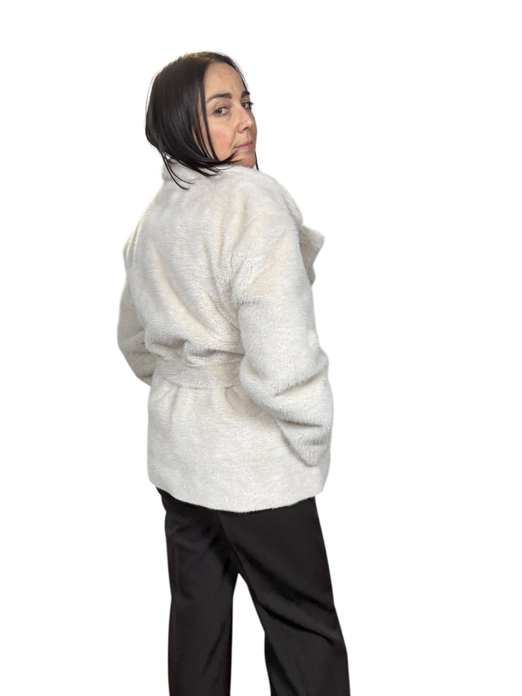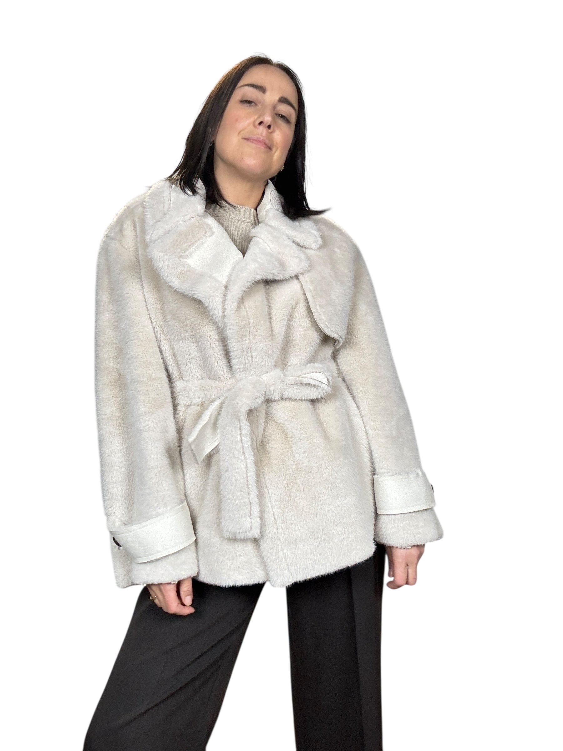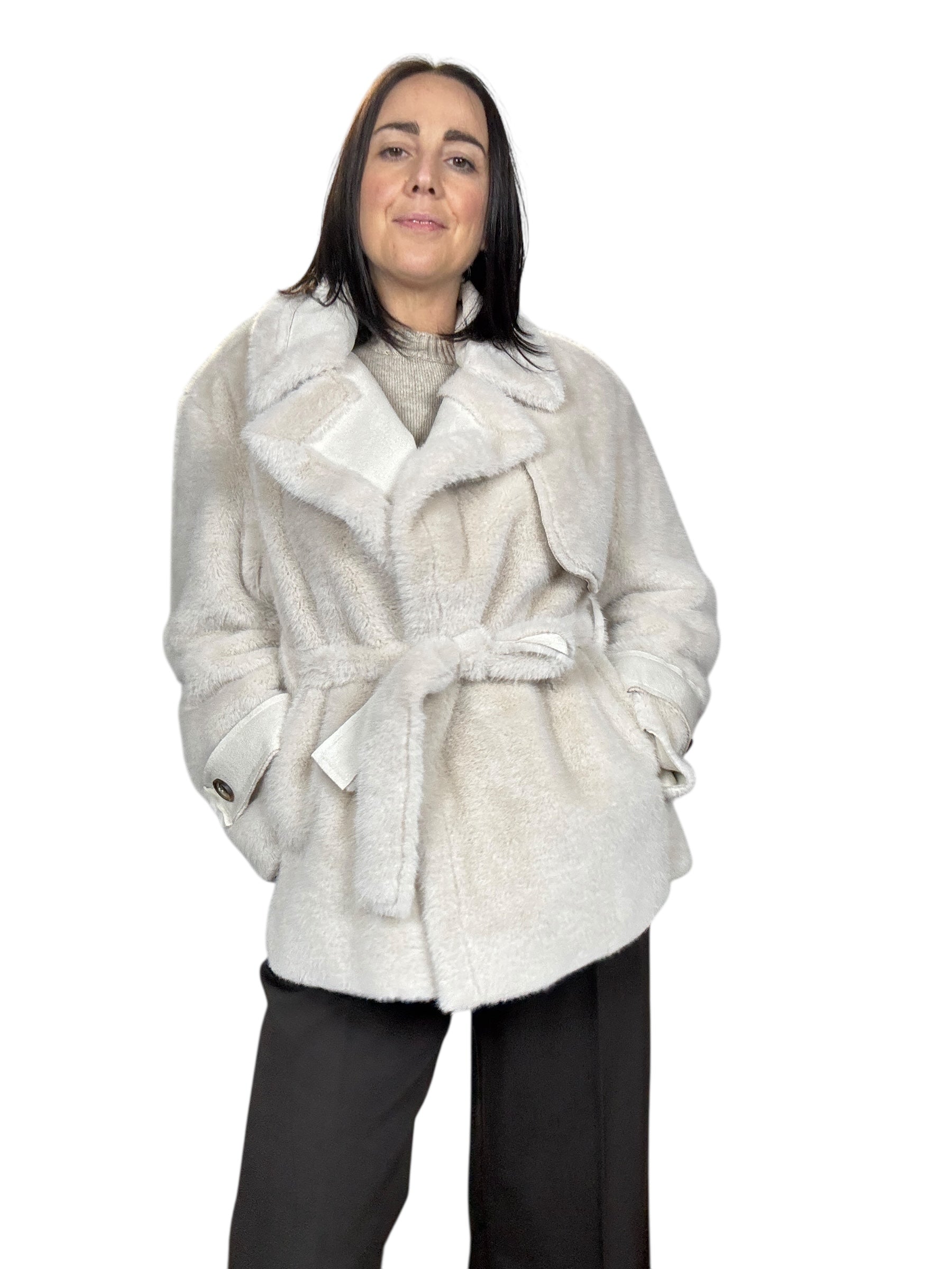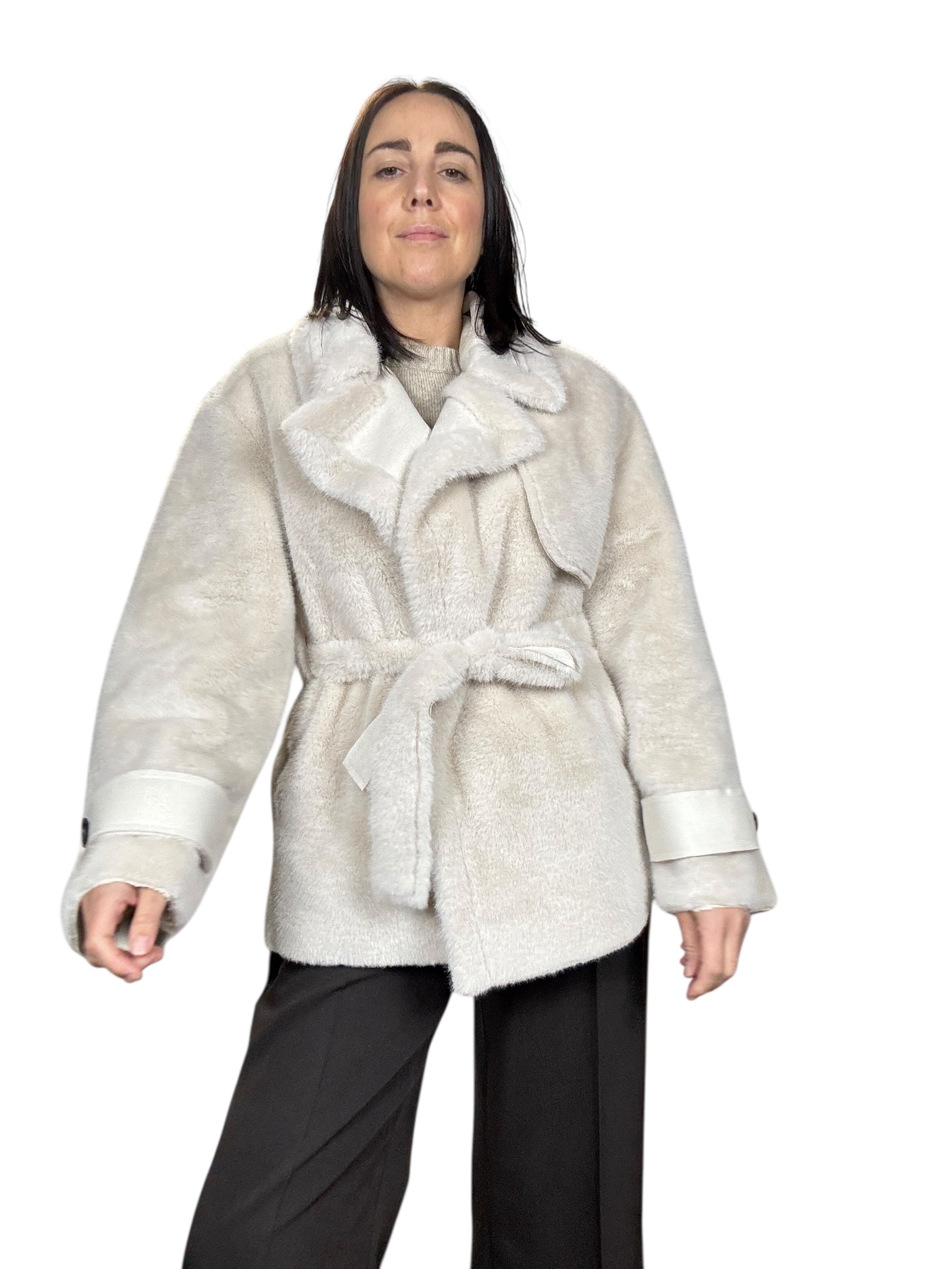 Pelliccia con interno in ecomontone e cintura in vita che consente di portarla chiusa e sfiancata