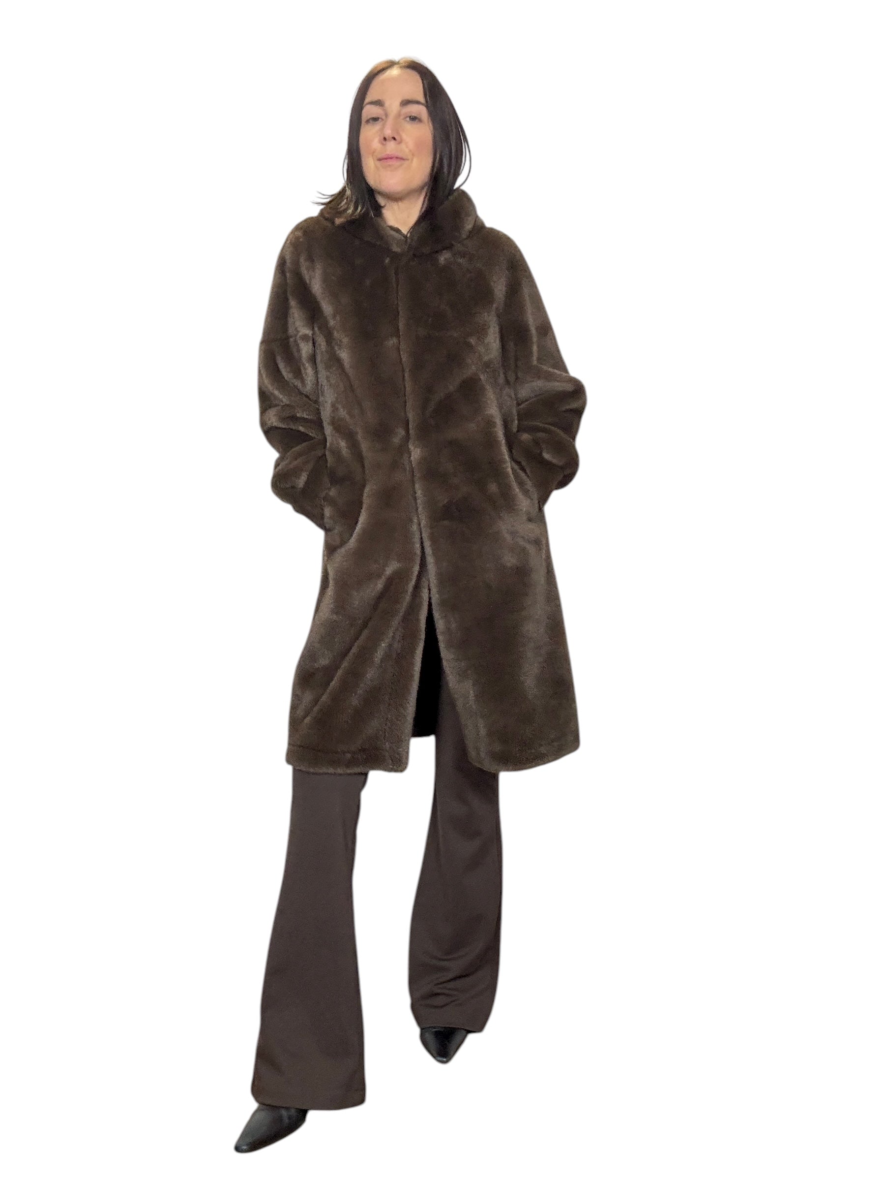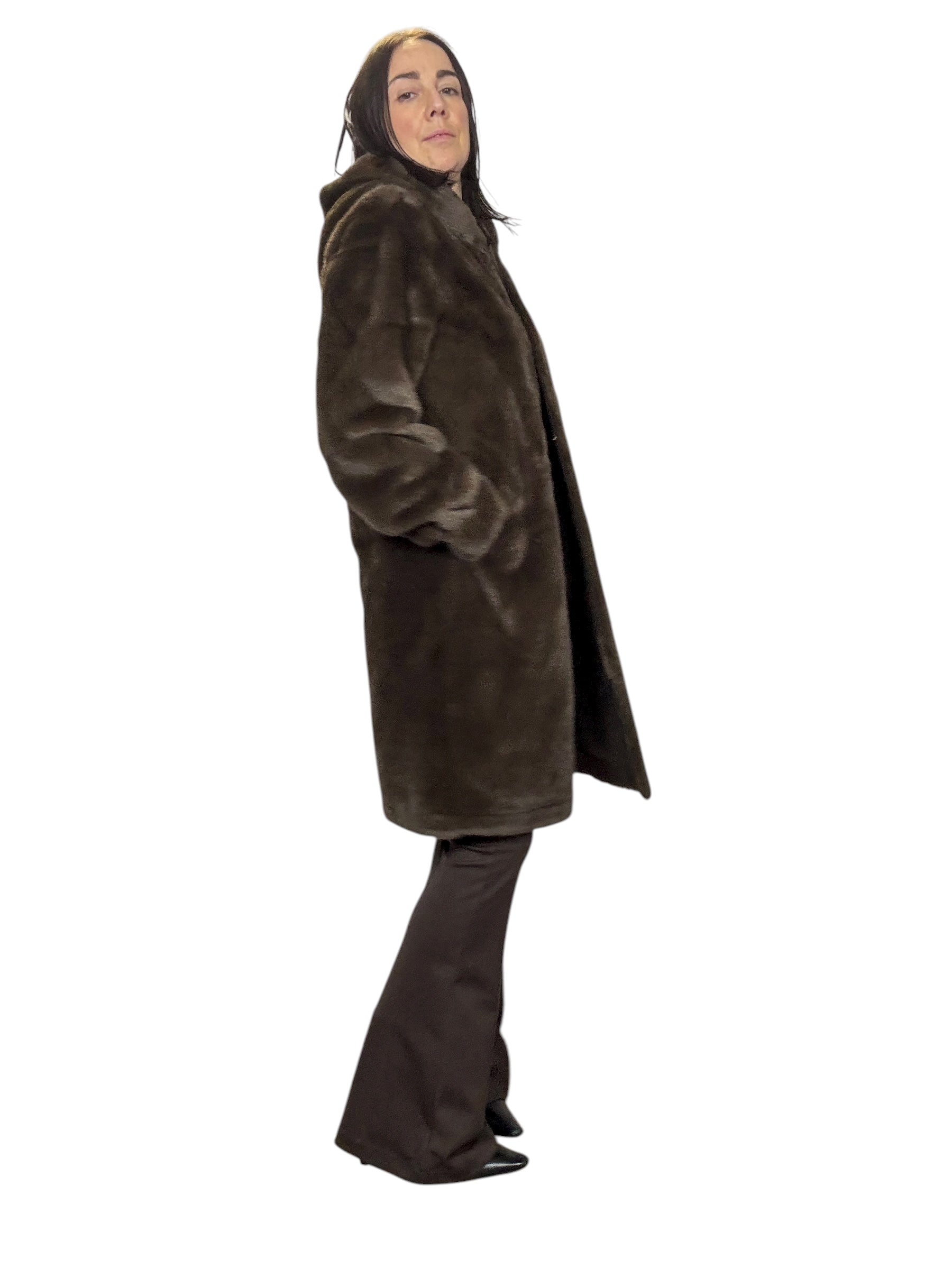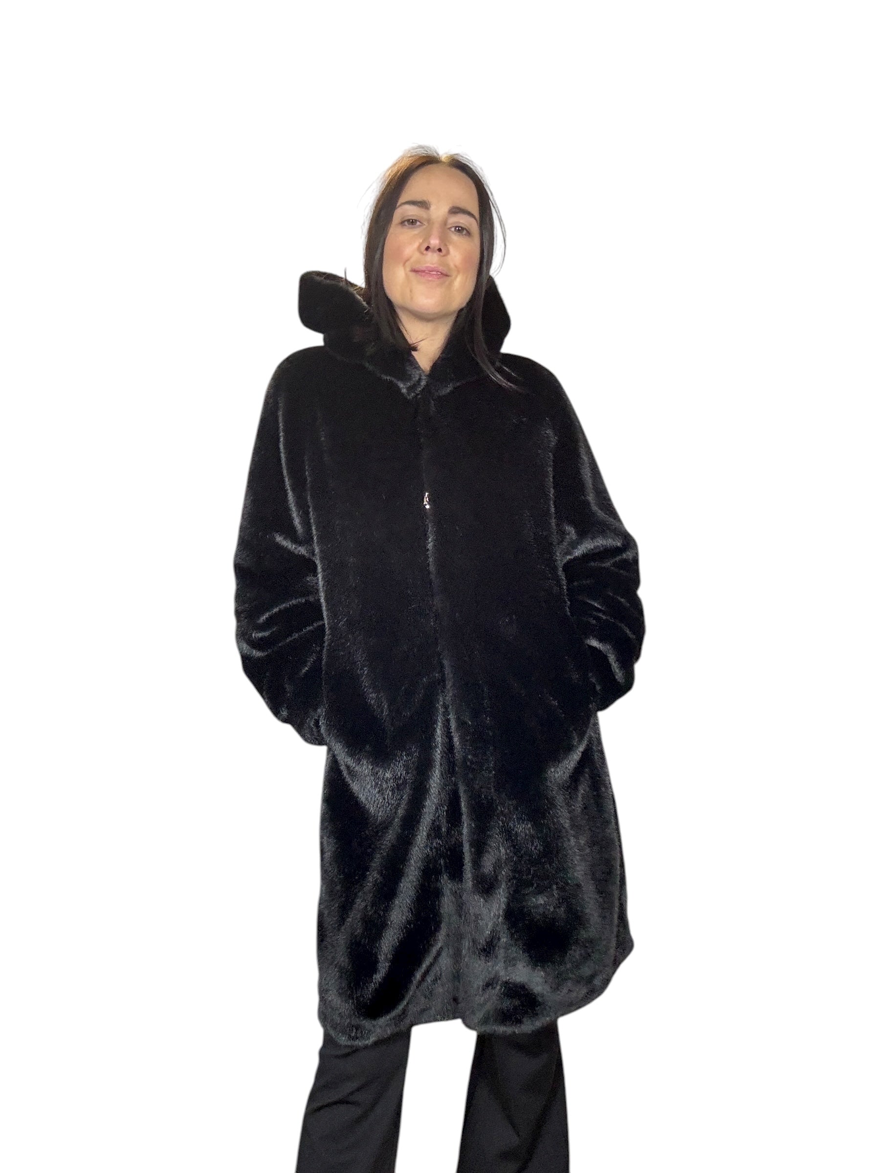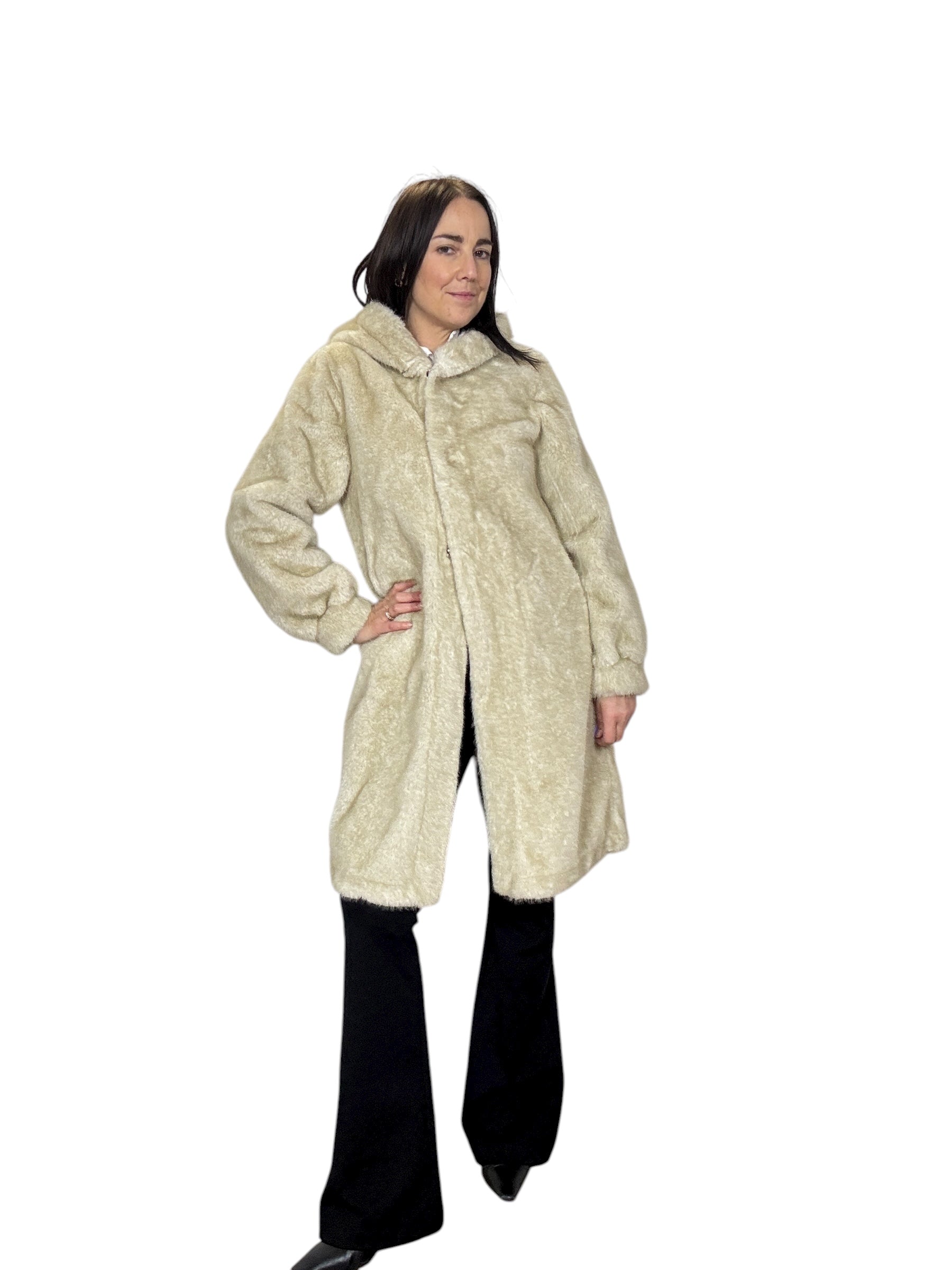 pelliccia lunga con cappuccio e tasche laterali. Modello leggermente svasato con interno in eco-dainetto, chiusura con bottoni automatici (tg in foto S)