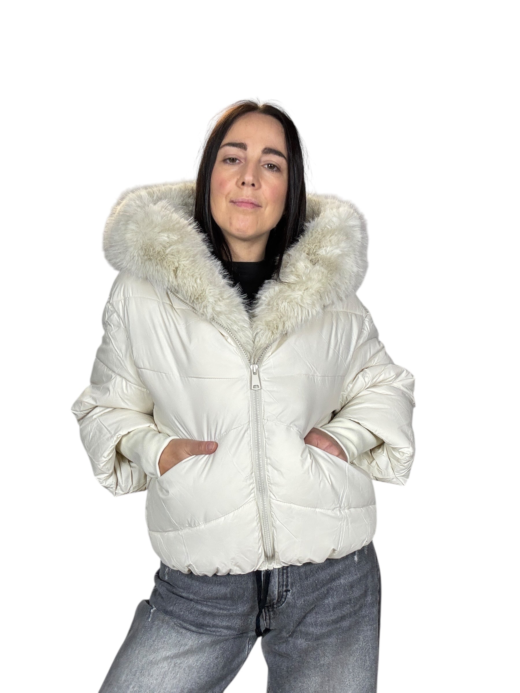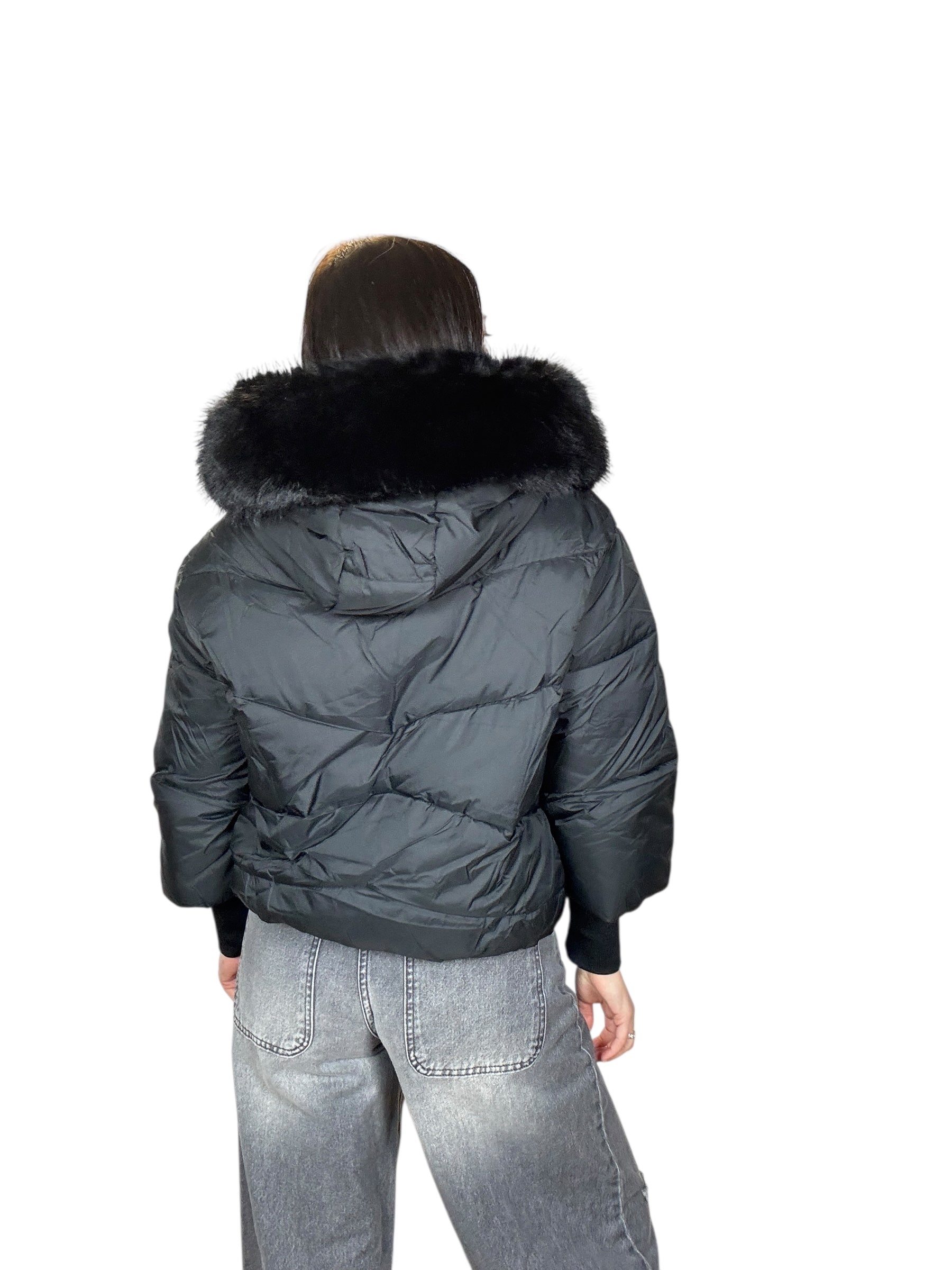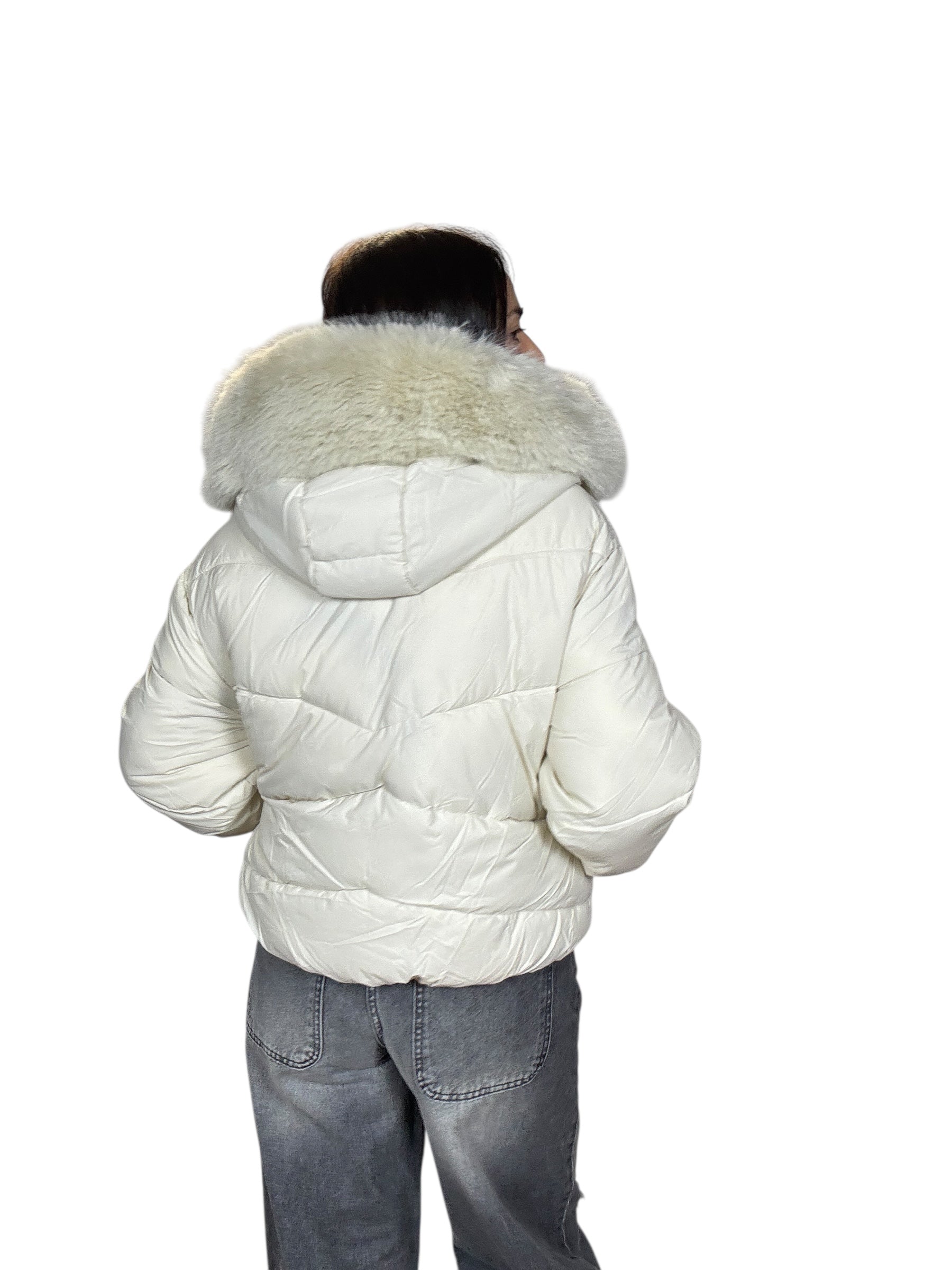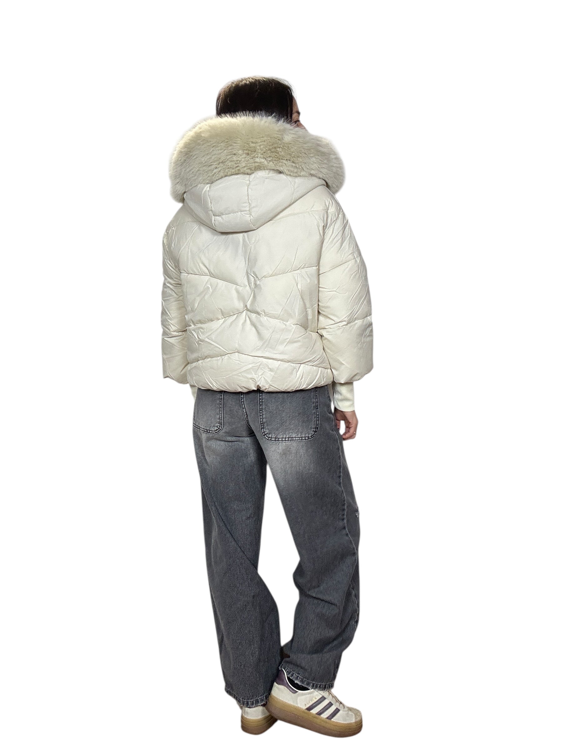 piumino foderato ed imbottito con tasche frontali e cappuccio. Dettaglio inserto in ecopelliccia che si può staccare grazie alla presenza di piccoli bottoncini. Modello corto e rimborsato
