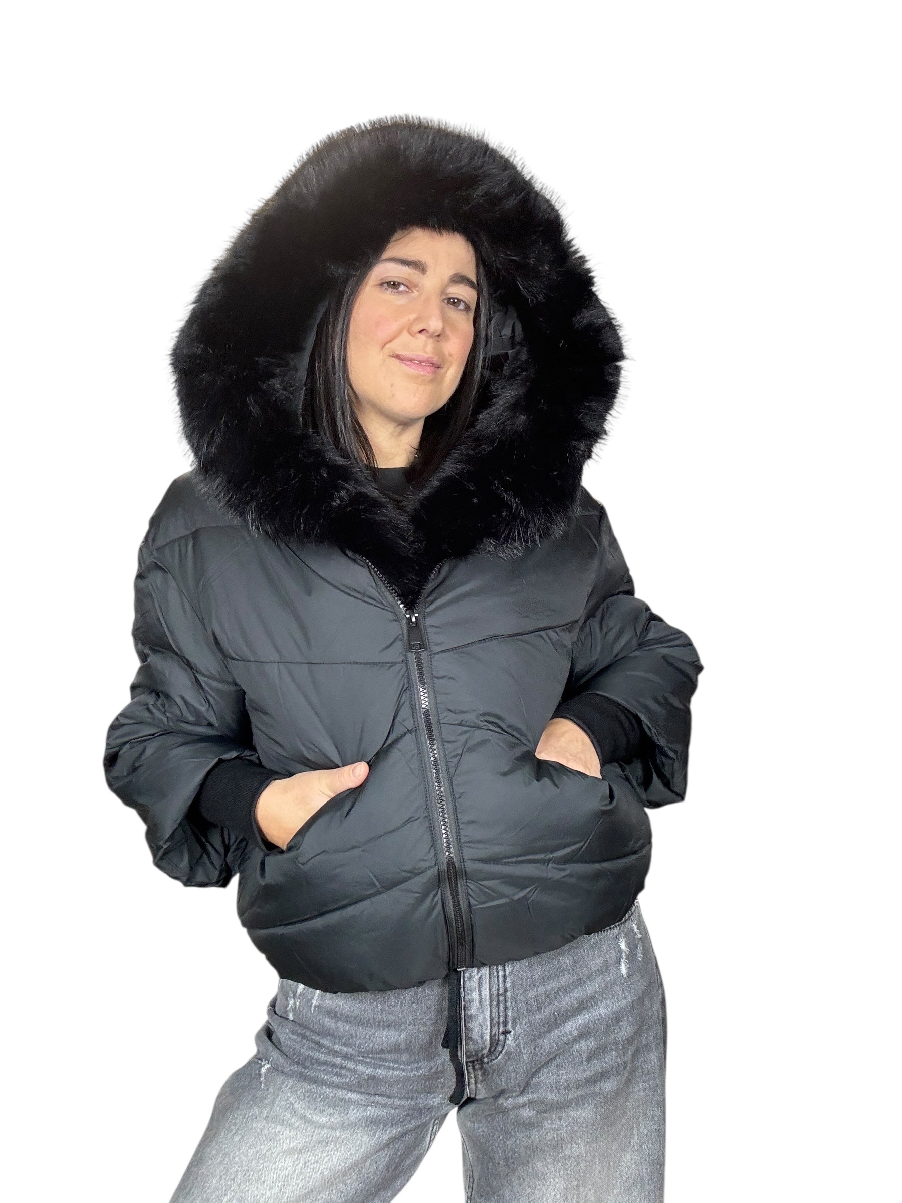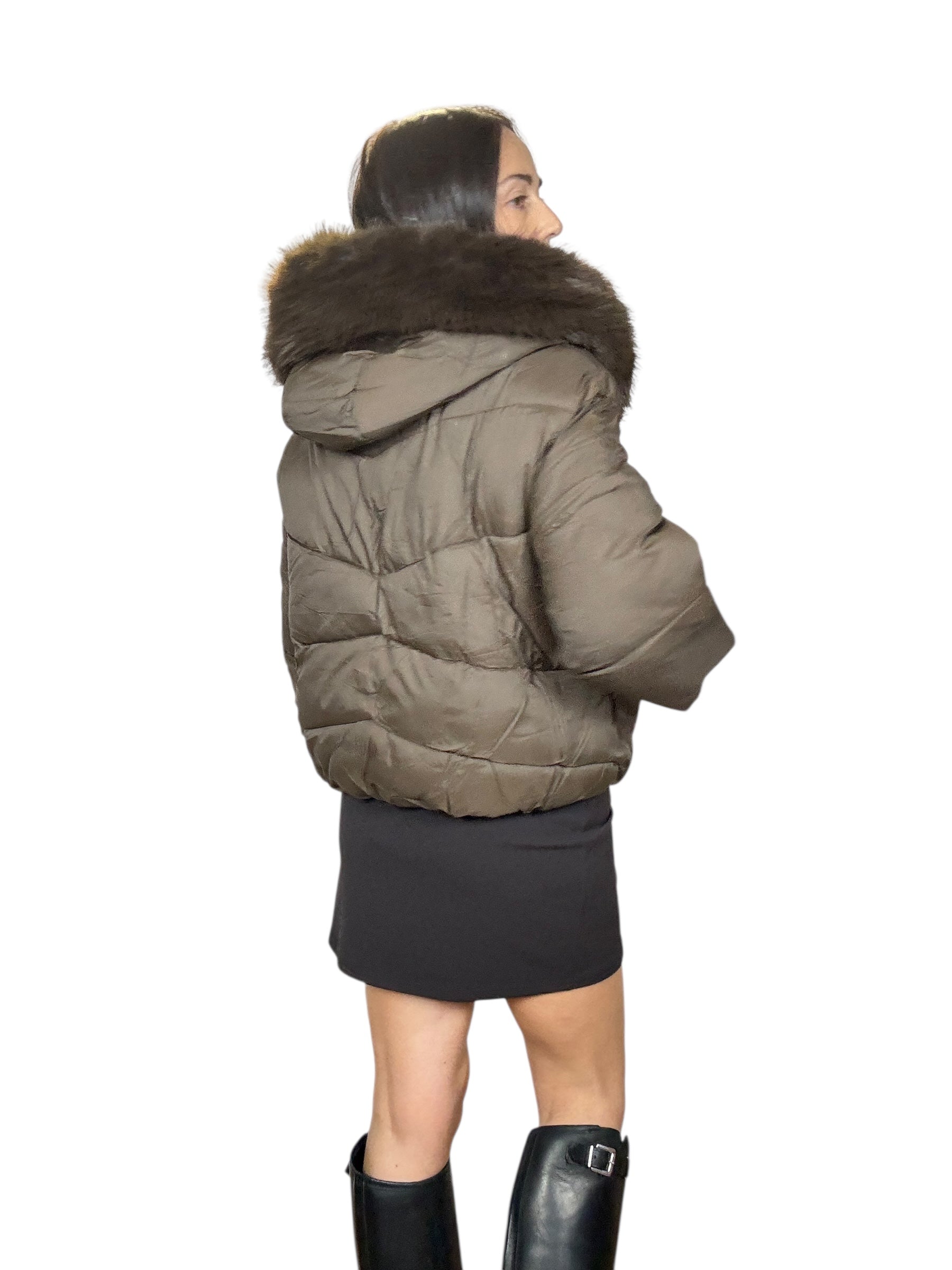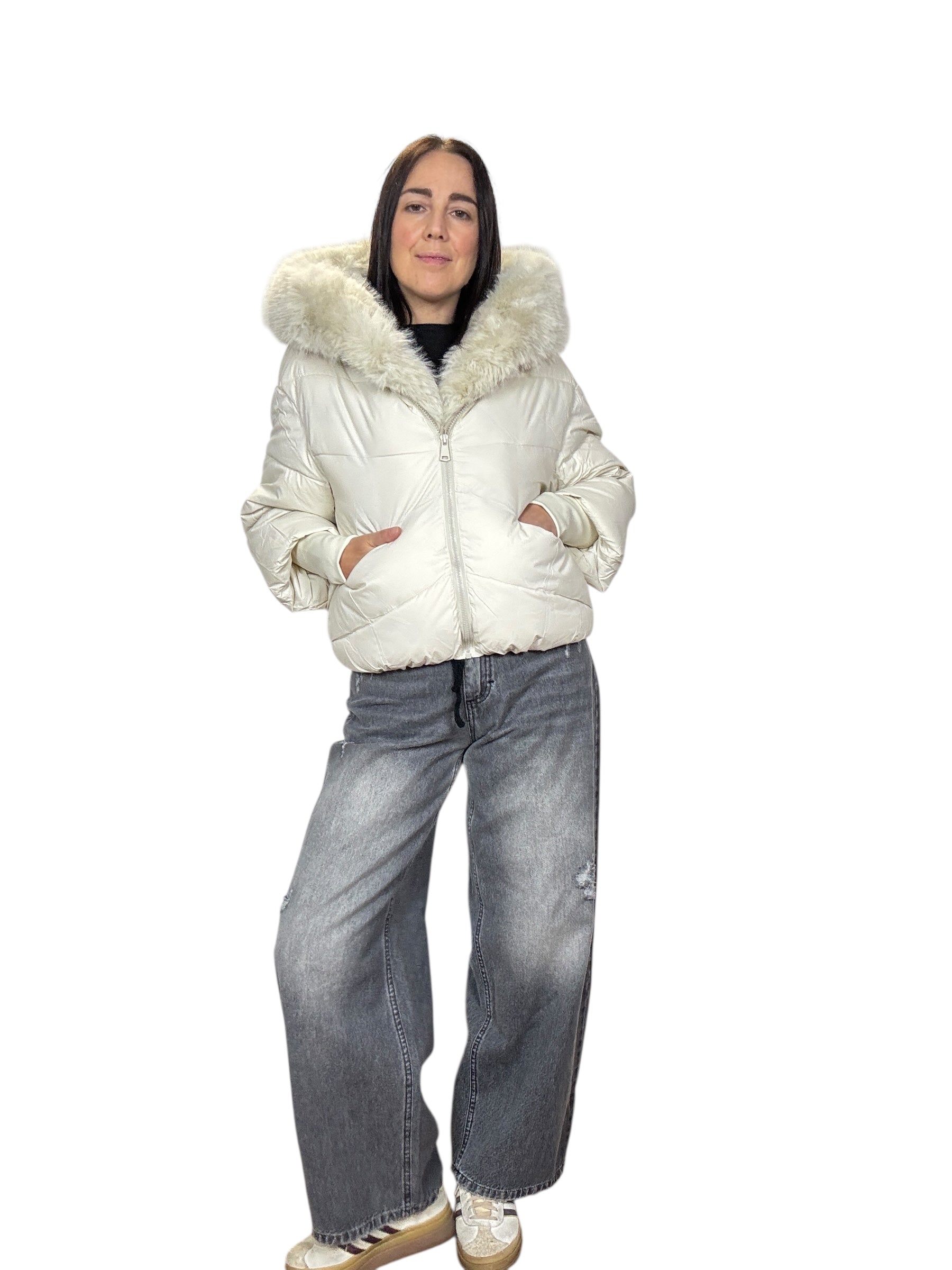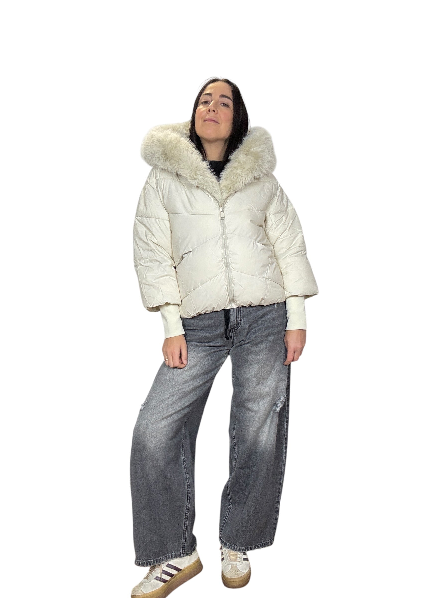 piumino foderato ed imbottito con tasche frontali e cappuccio. Dettaglio inserto in ecopelliccia che si può staccare grazie alla presenza di piccoli bottoncini. Modello corto e rimborsato