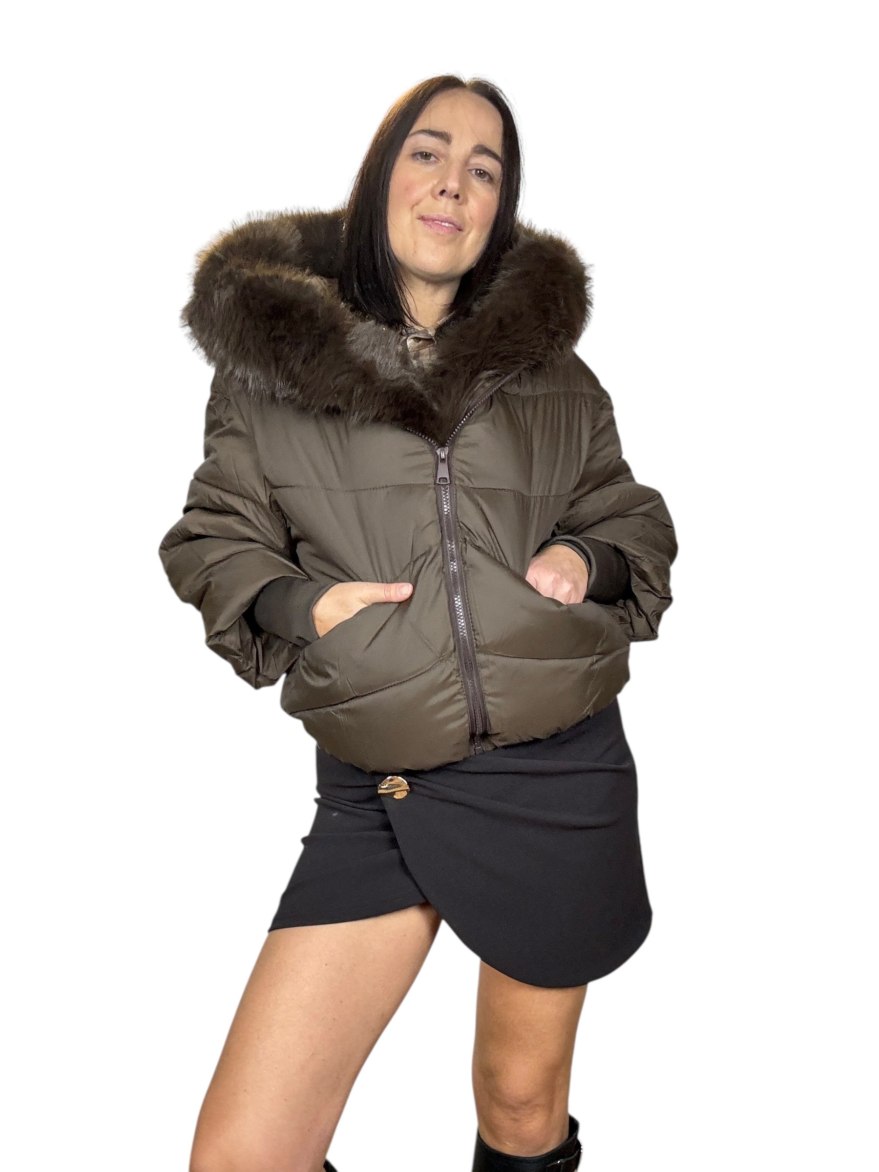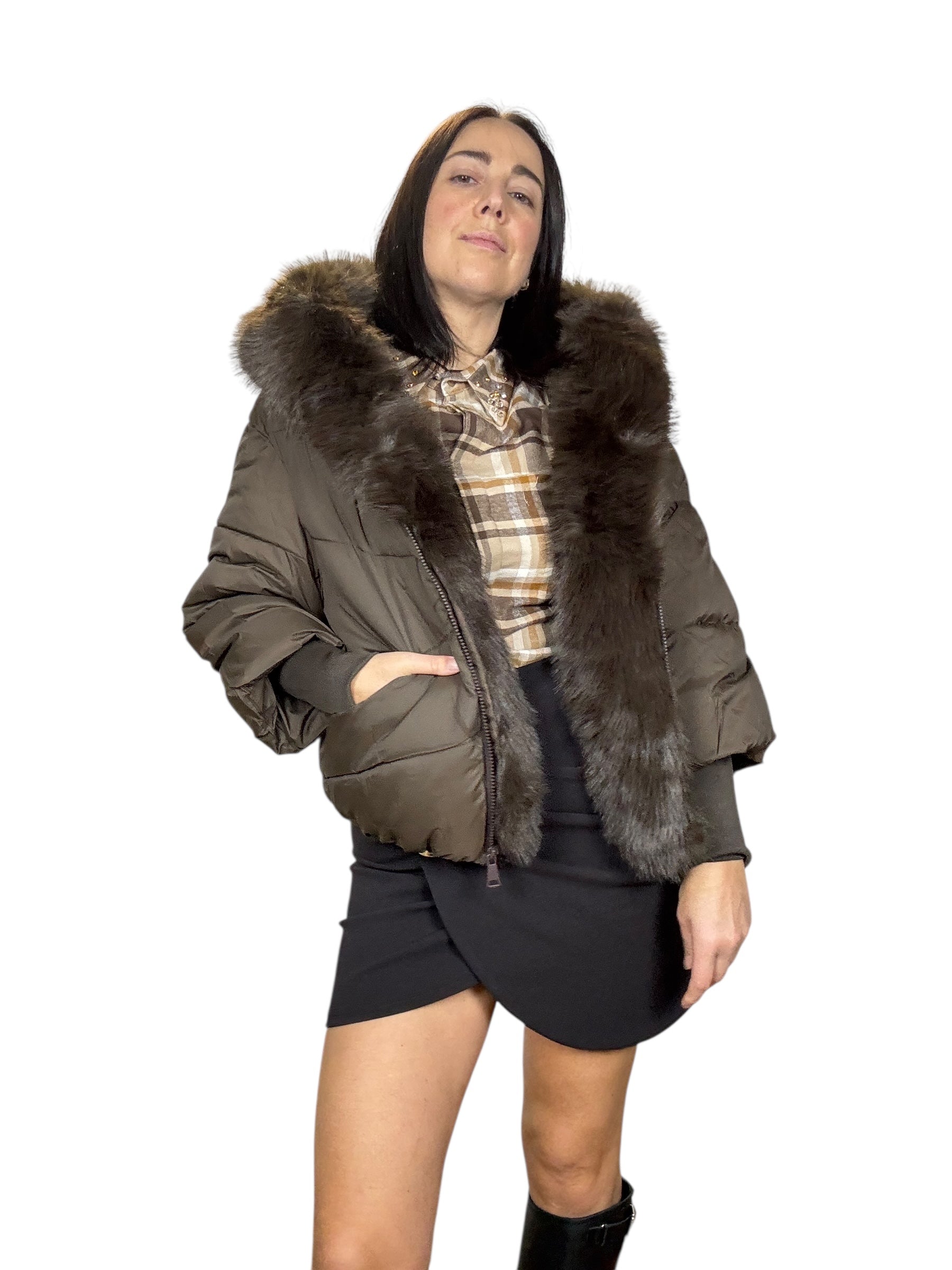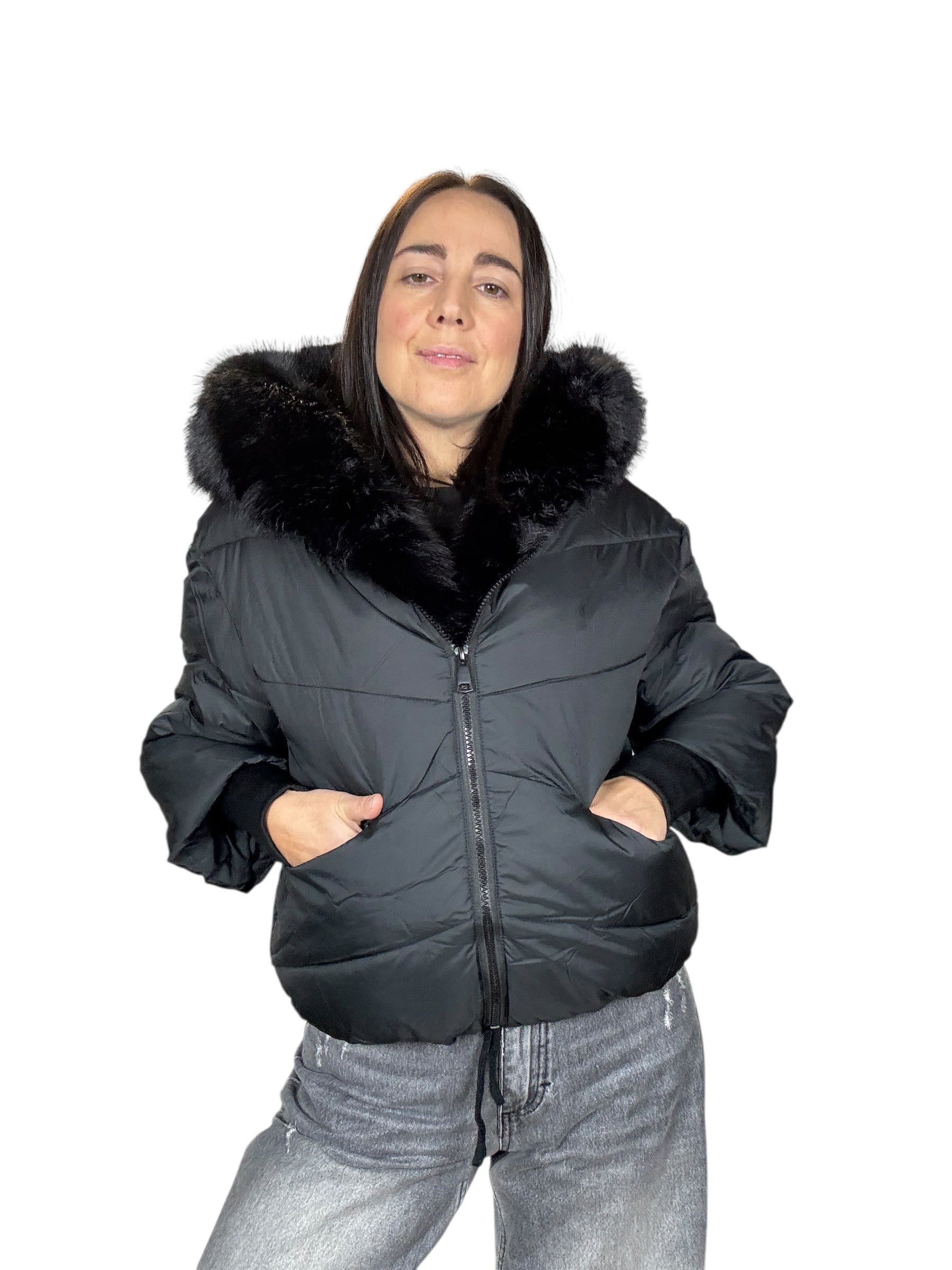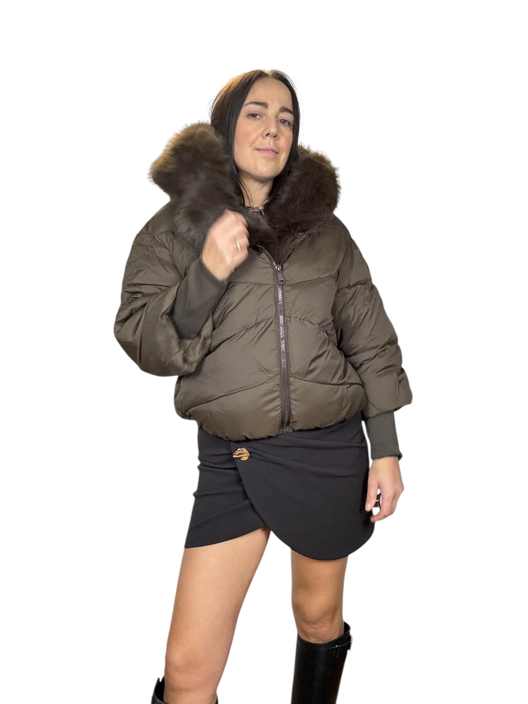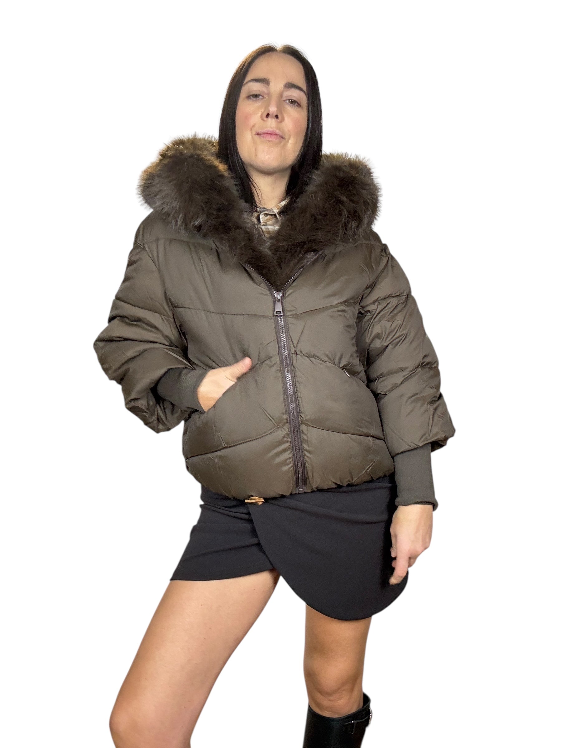 piumino foderato ed imbottito con tasche frontali e cappuccio. Dettaglio inserto in ecopelliccia che si può staccare grazie alla presenza di piccoli bottoncini. Modello corto e rimborsato