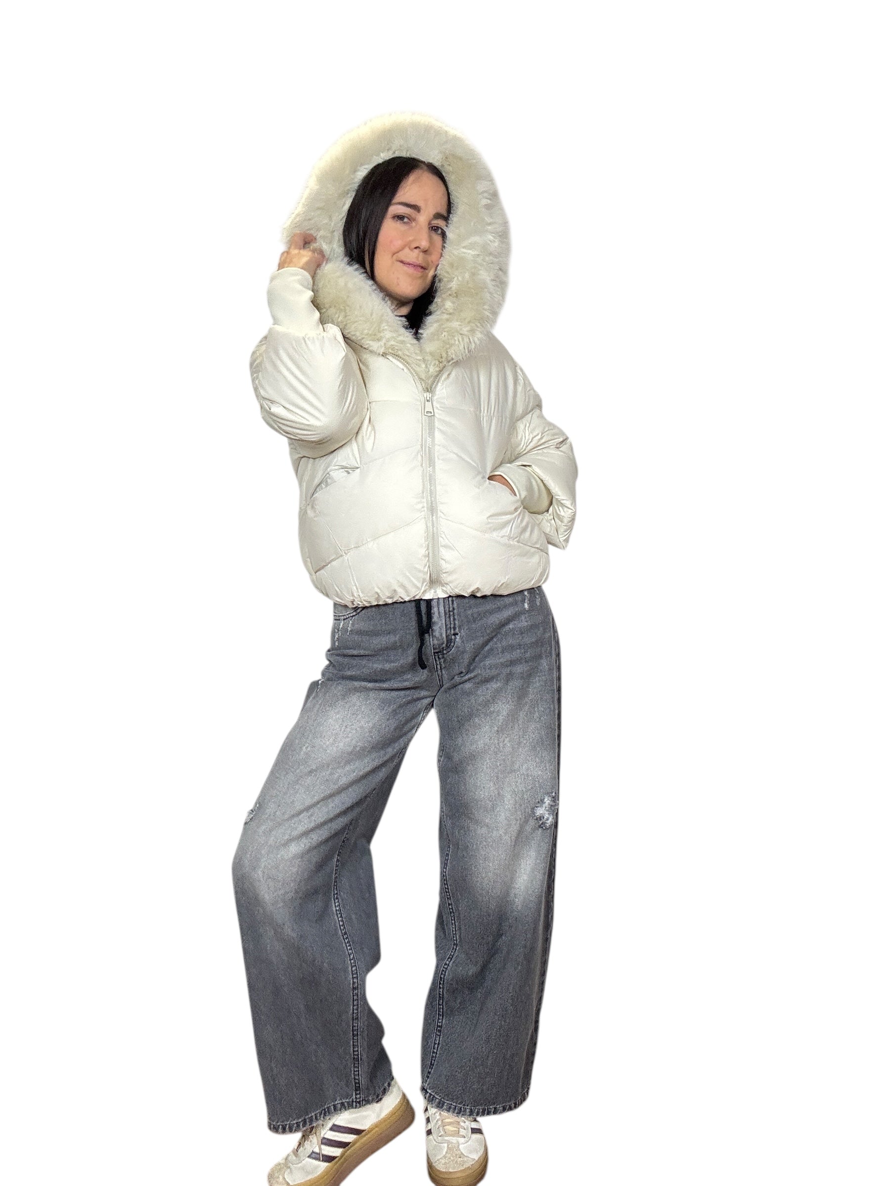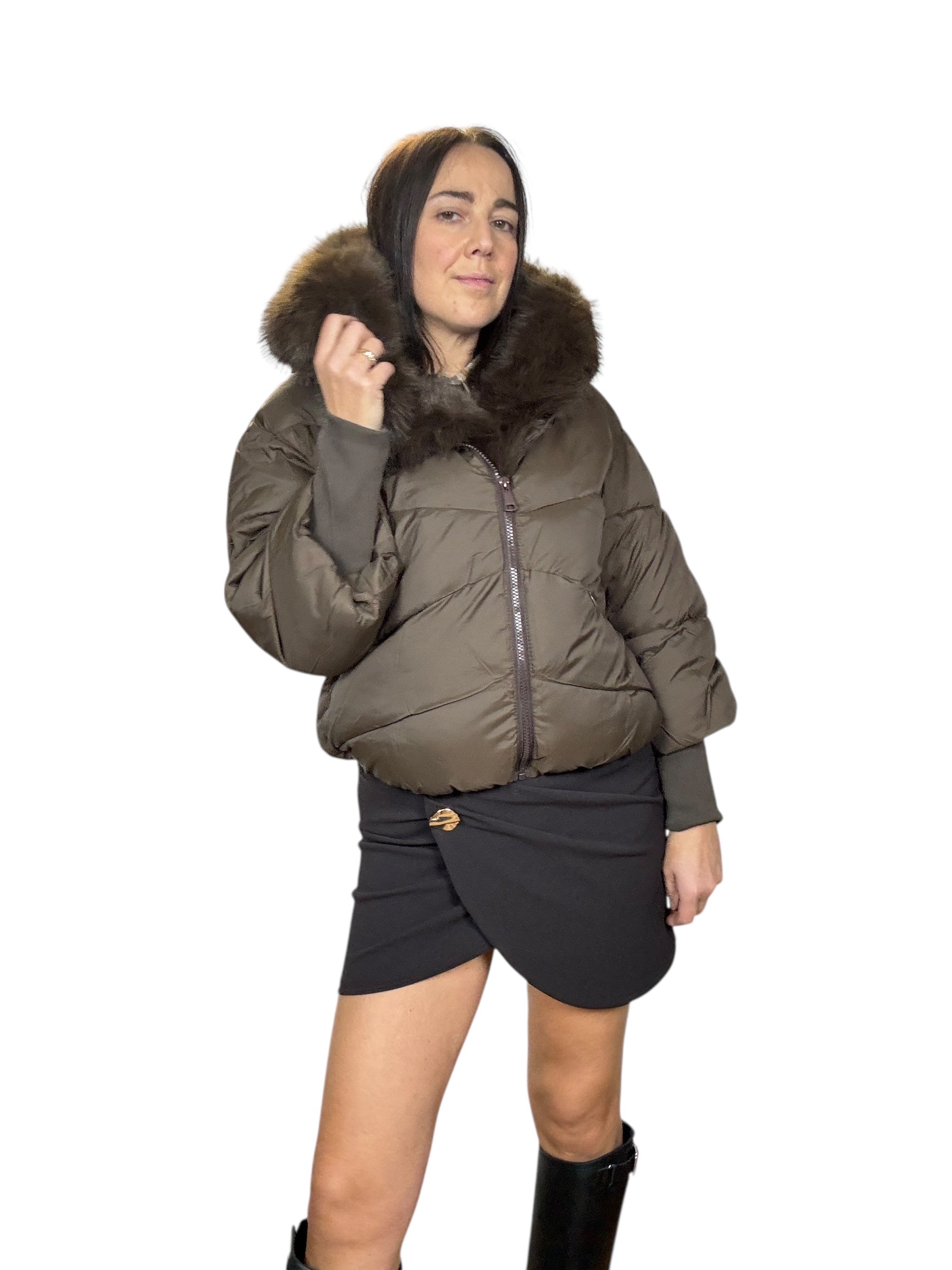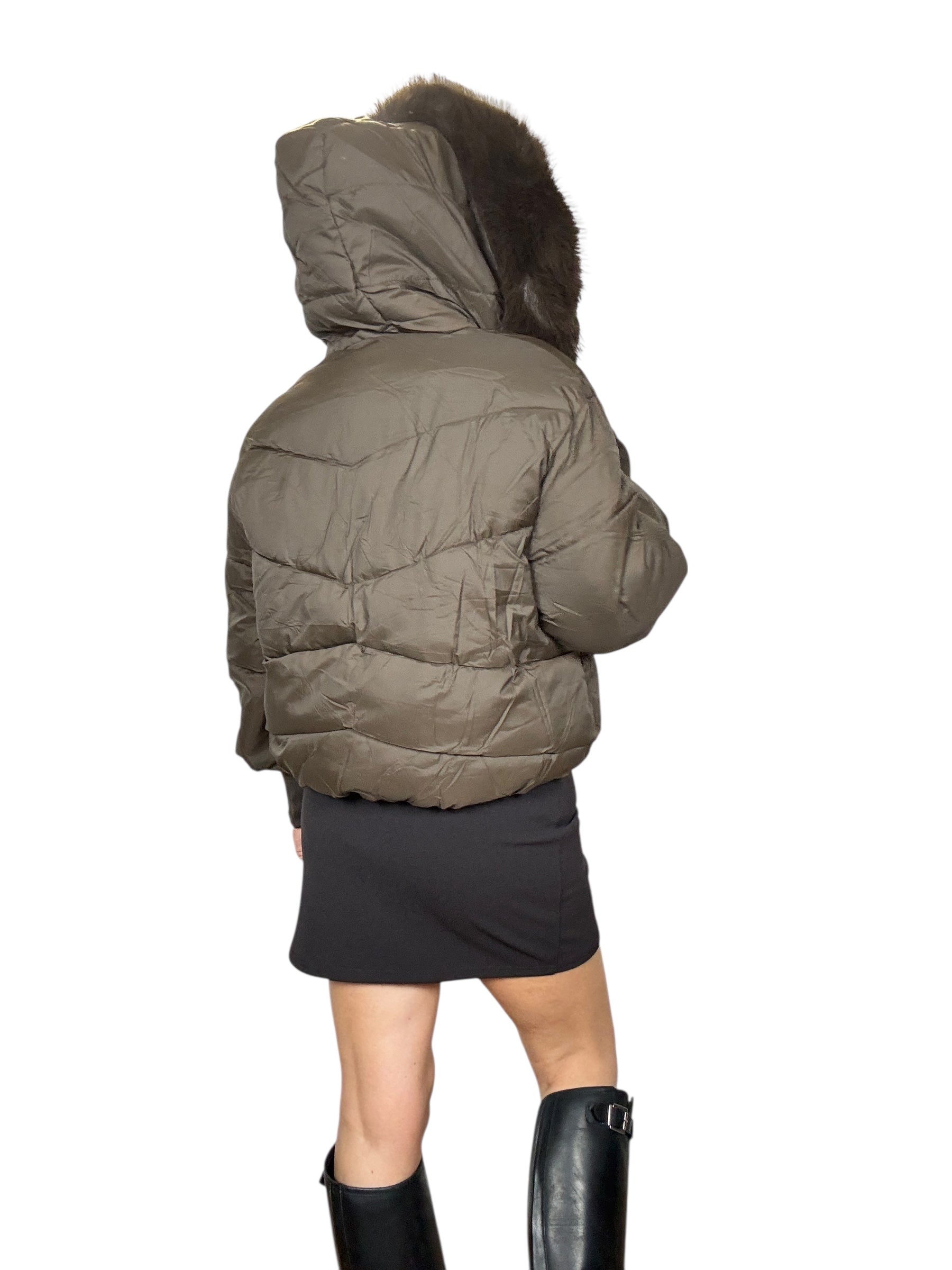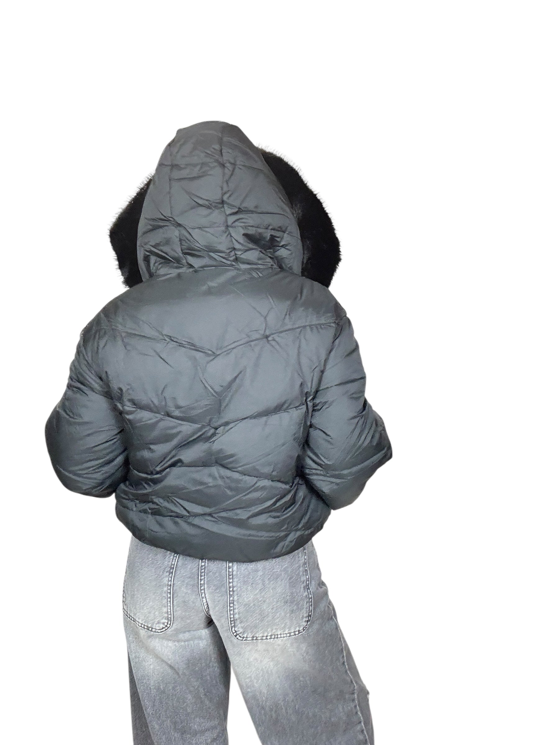 piumino foderato ed imbottito con tasche frontali e cappuccio. Dettaglio inserto in ecopelliccia che si può staccare grazie alla presenza di piccoli bottoncini. Modello corto e rimborsato