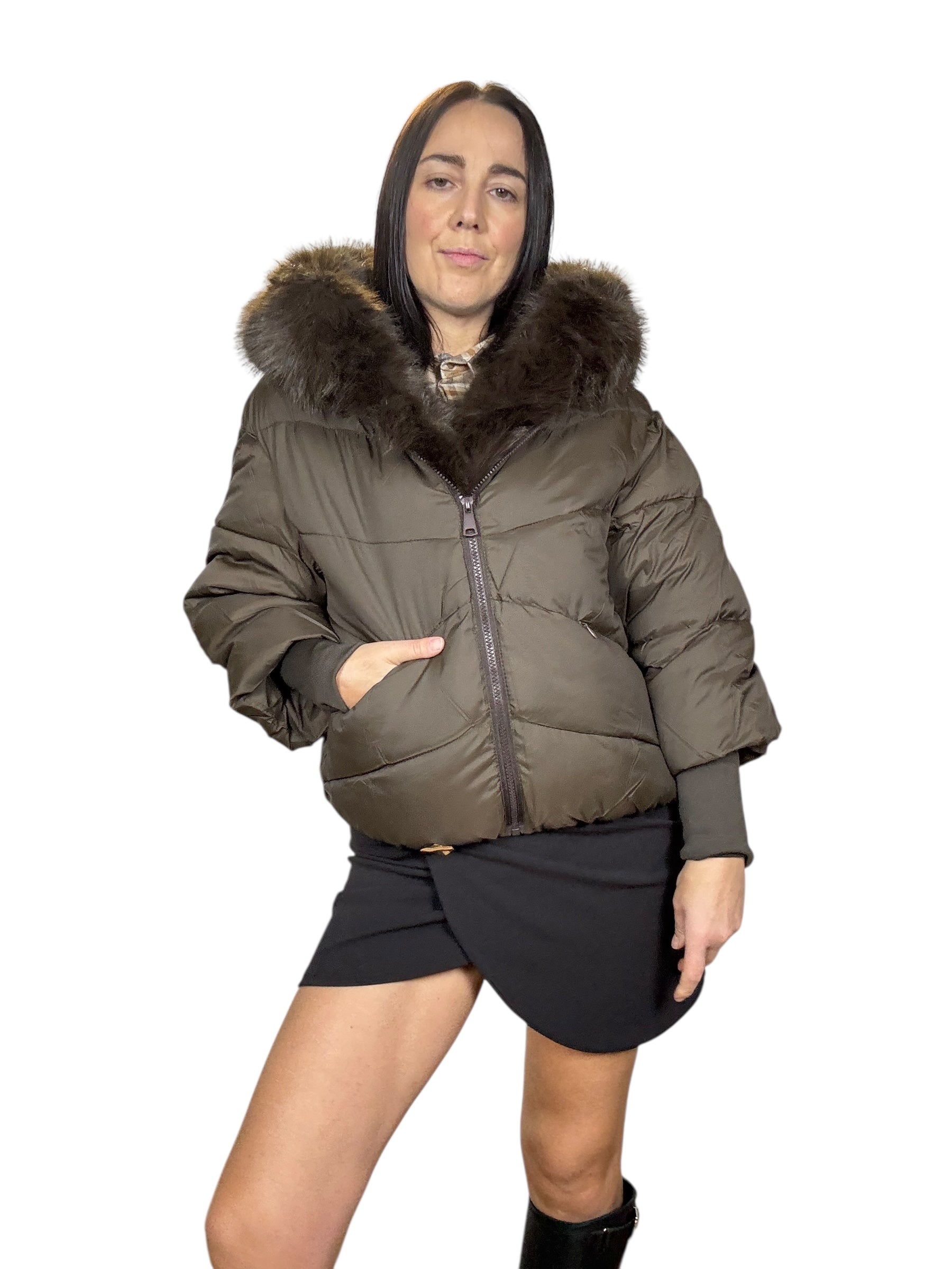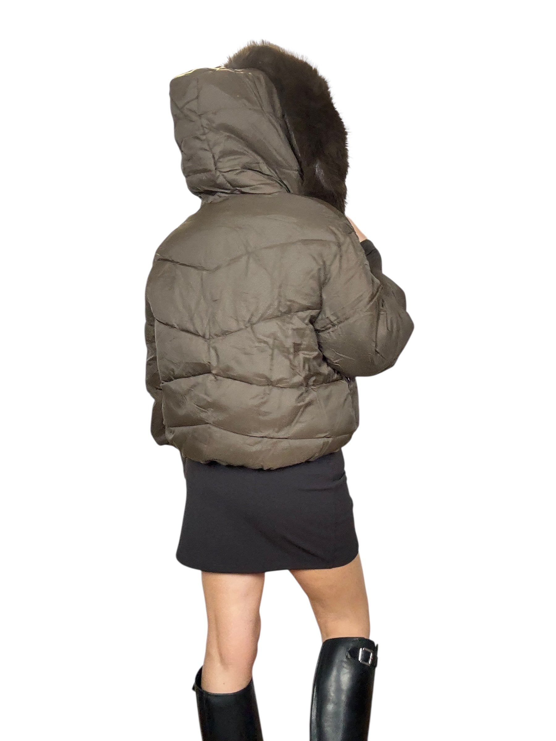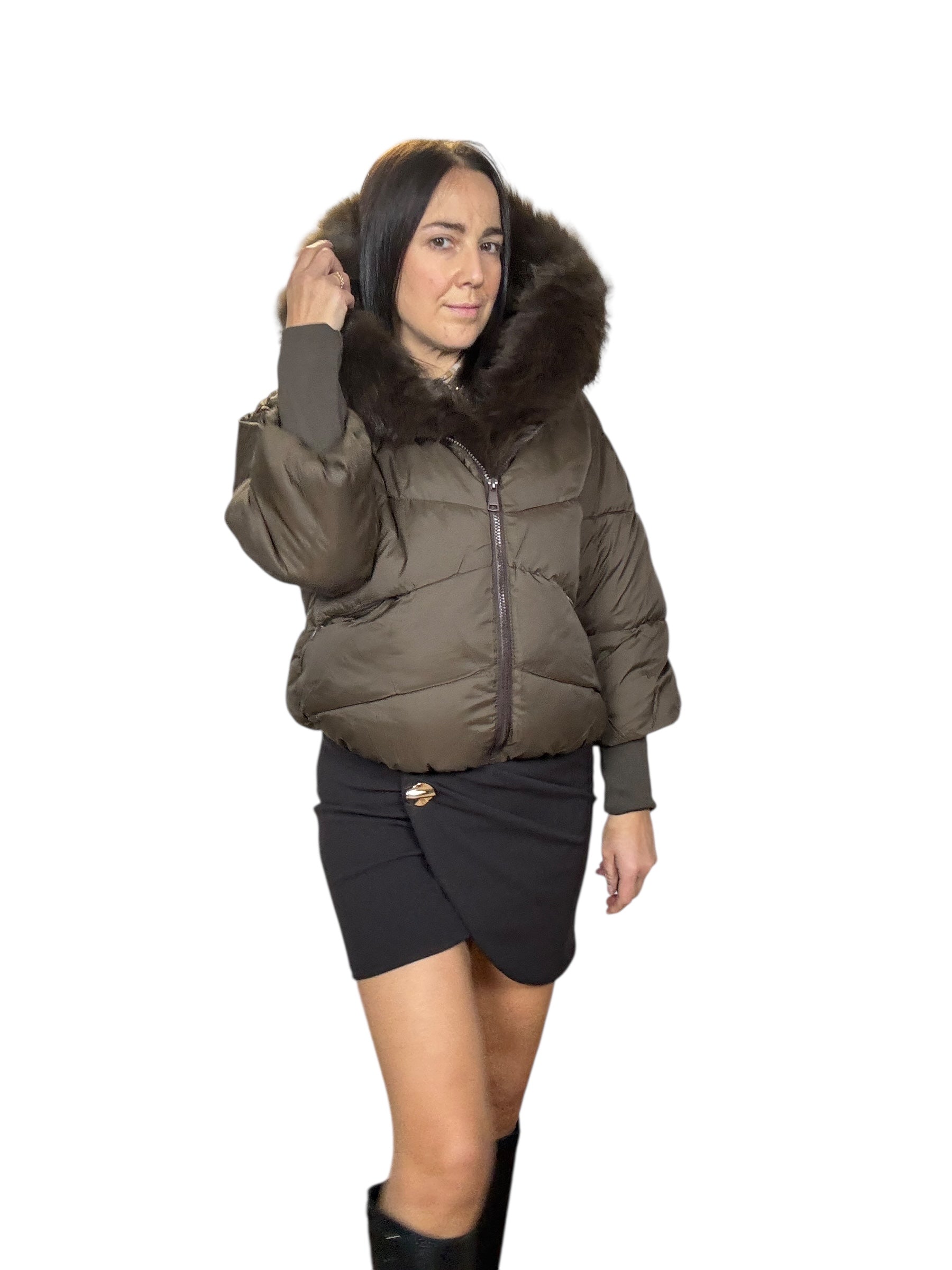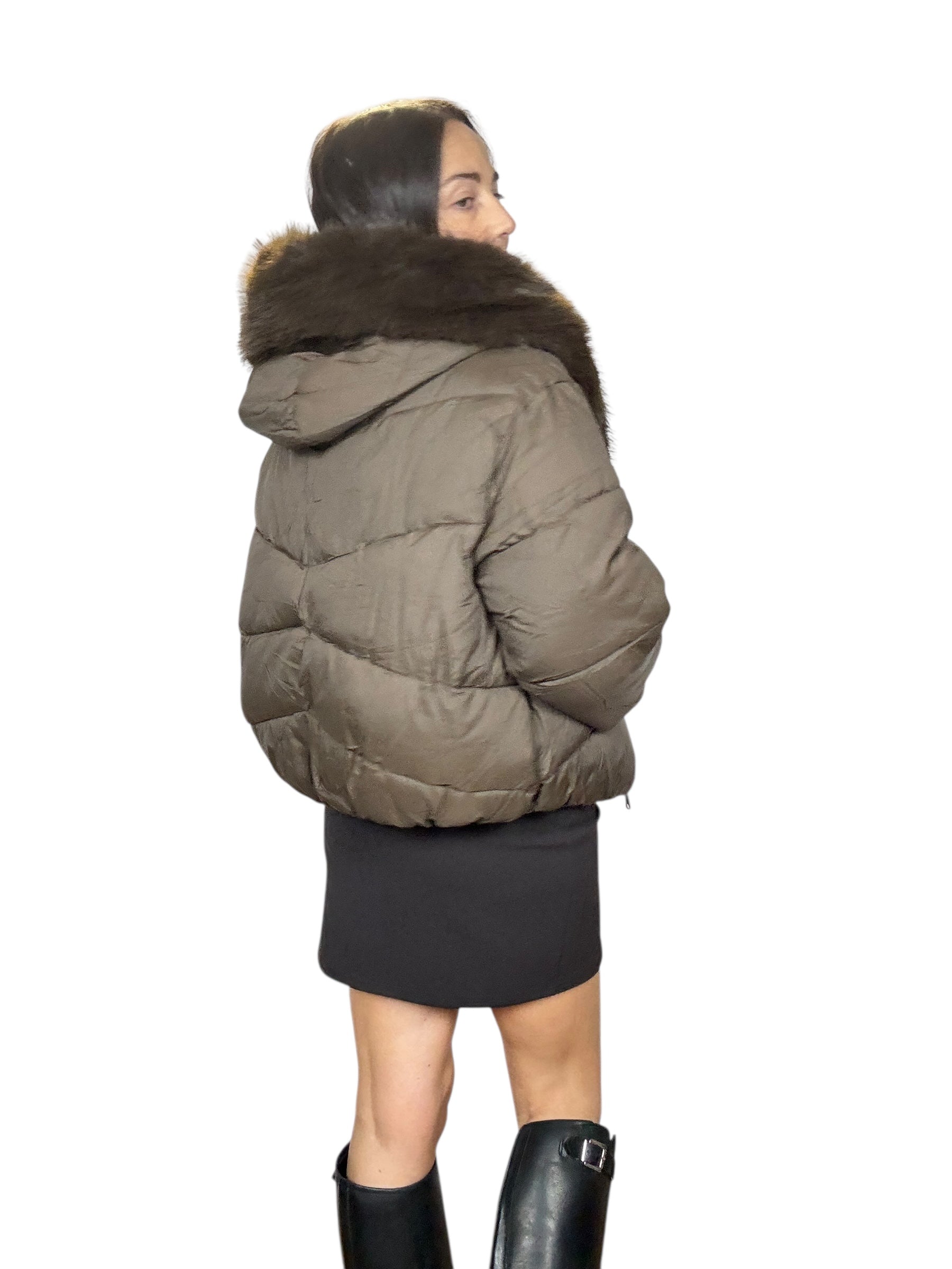 piumino foderato ed imbottito con tasche frontali e cappuccio. Dettaglio inserto in ecopelliccia che si può staccare grazie alla presenza di piccoli bottoncini. Modello corto e rimborsato