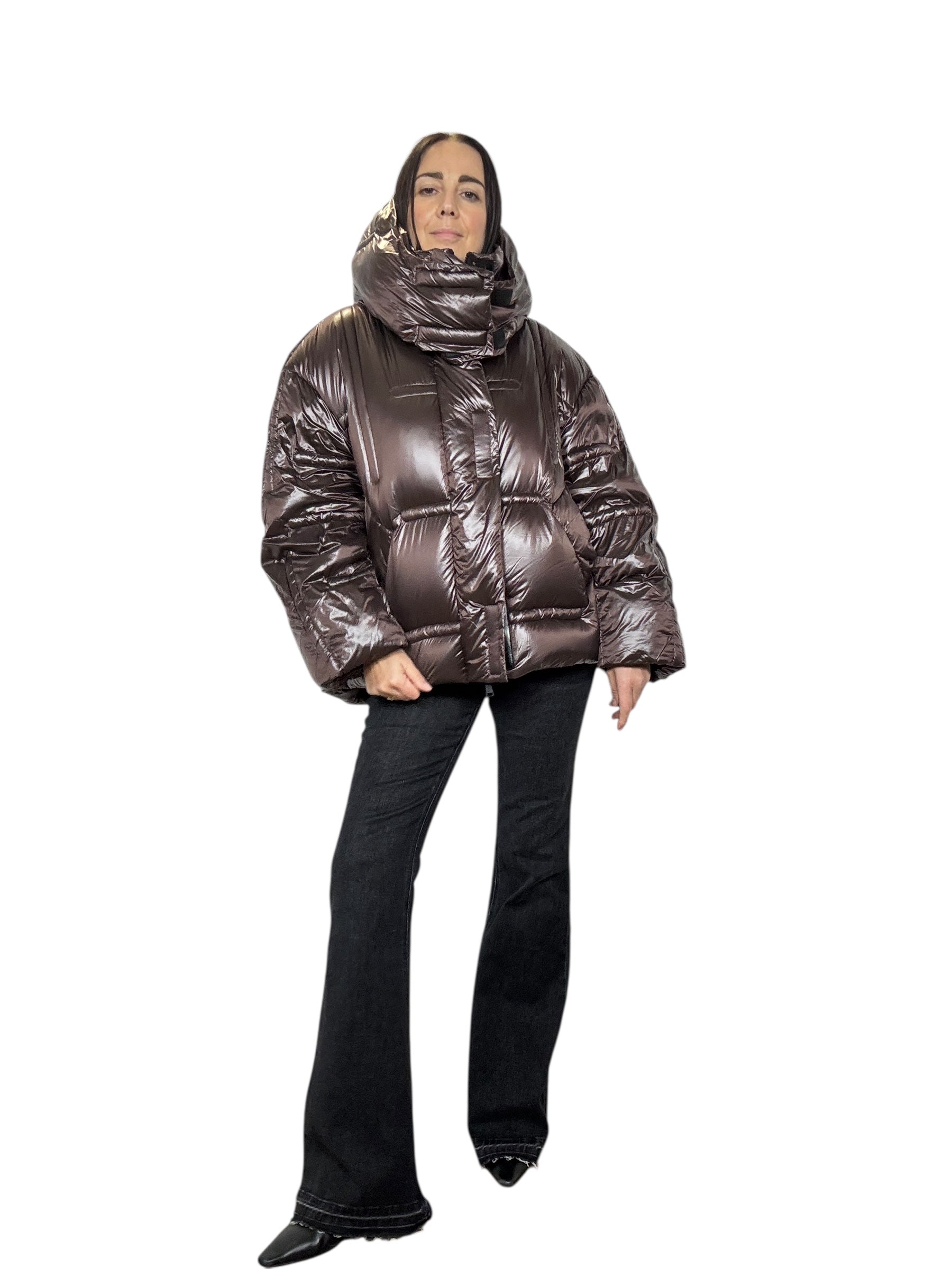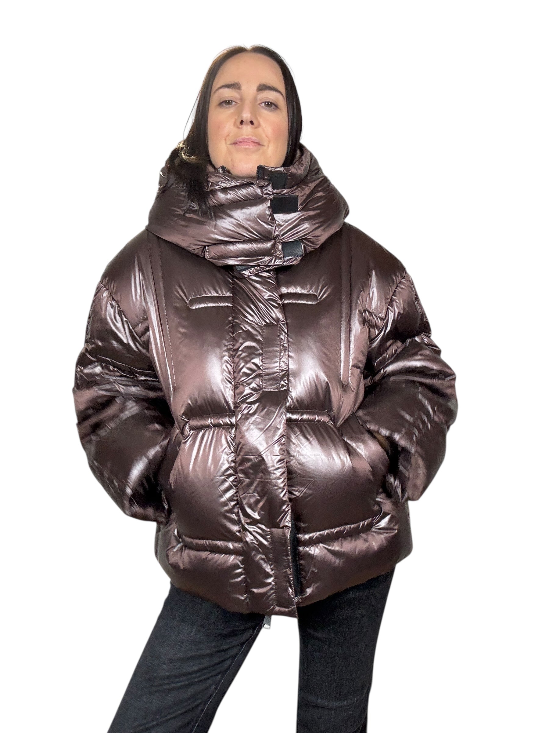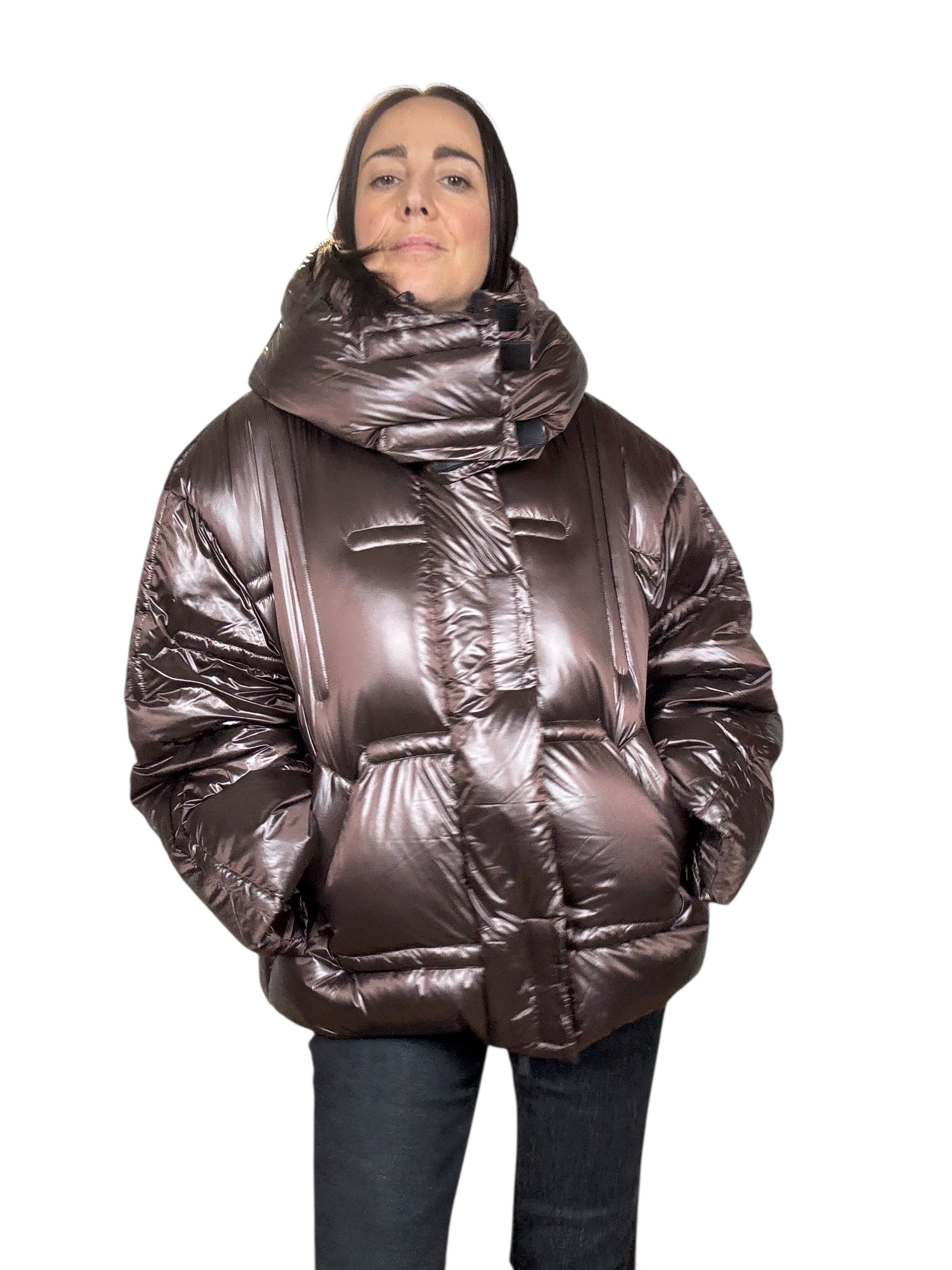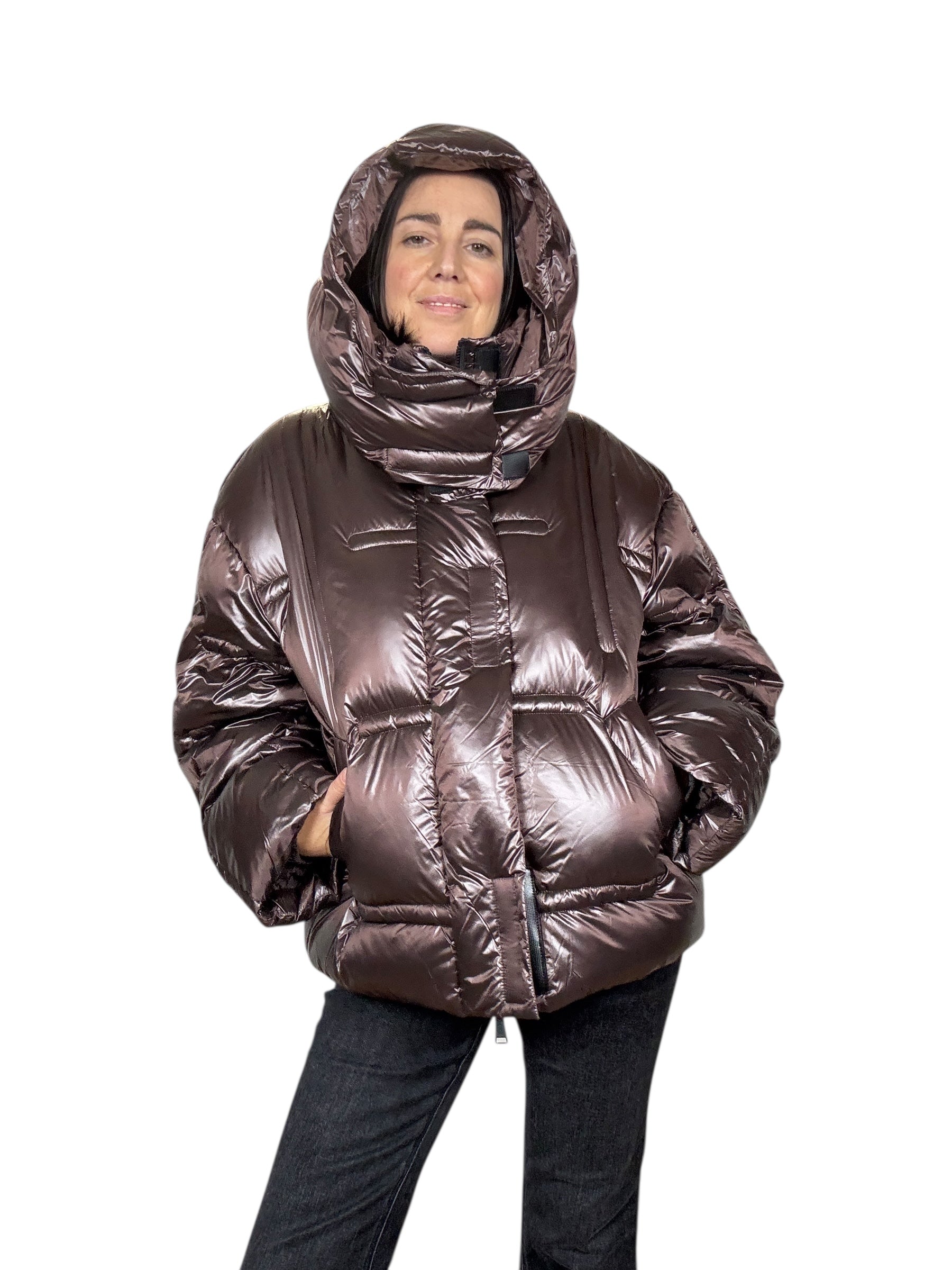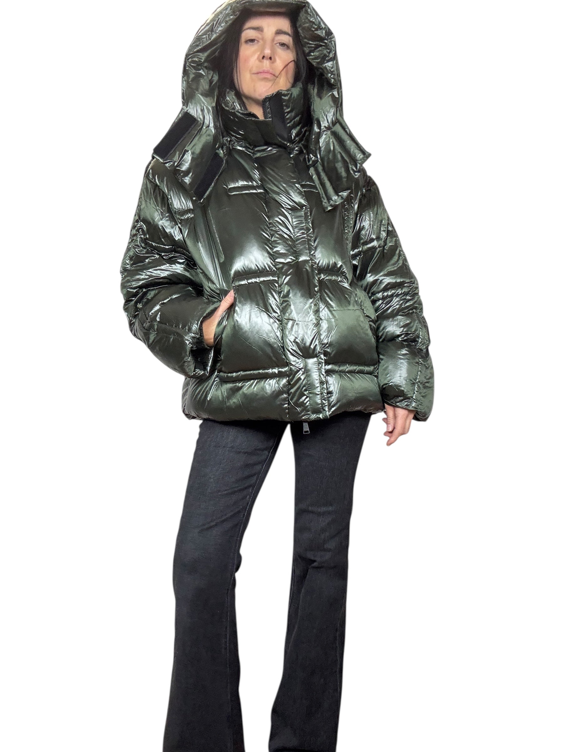 Piumino corto con collo a fascetta e cappuccio staccabile. Modello oversize con tasche laterali, chiusura con zip e strappo frontale. VESTIBILITA' OVERSIZE, VERA PIUMA