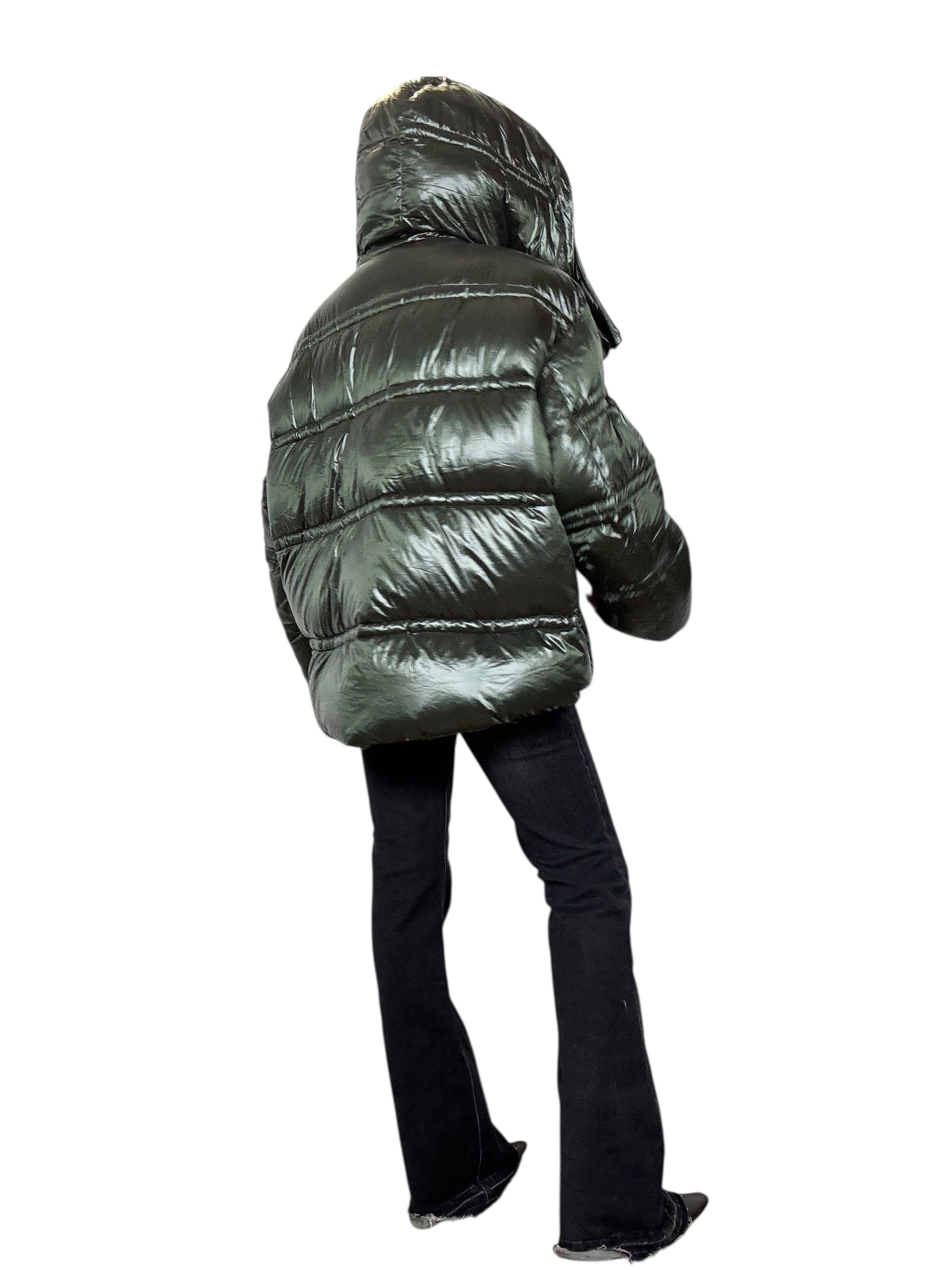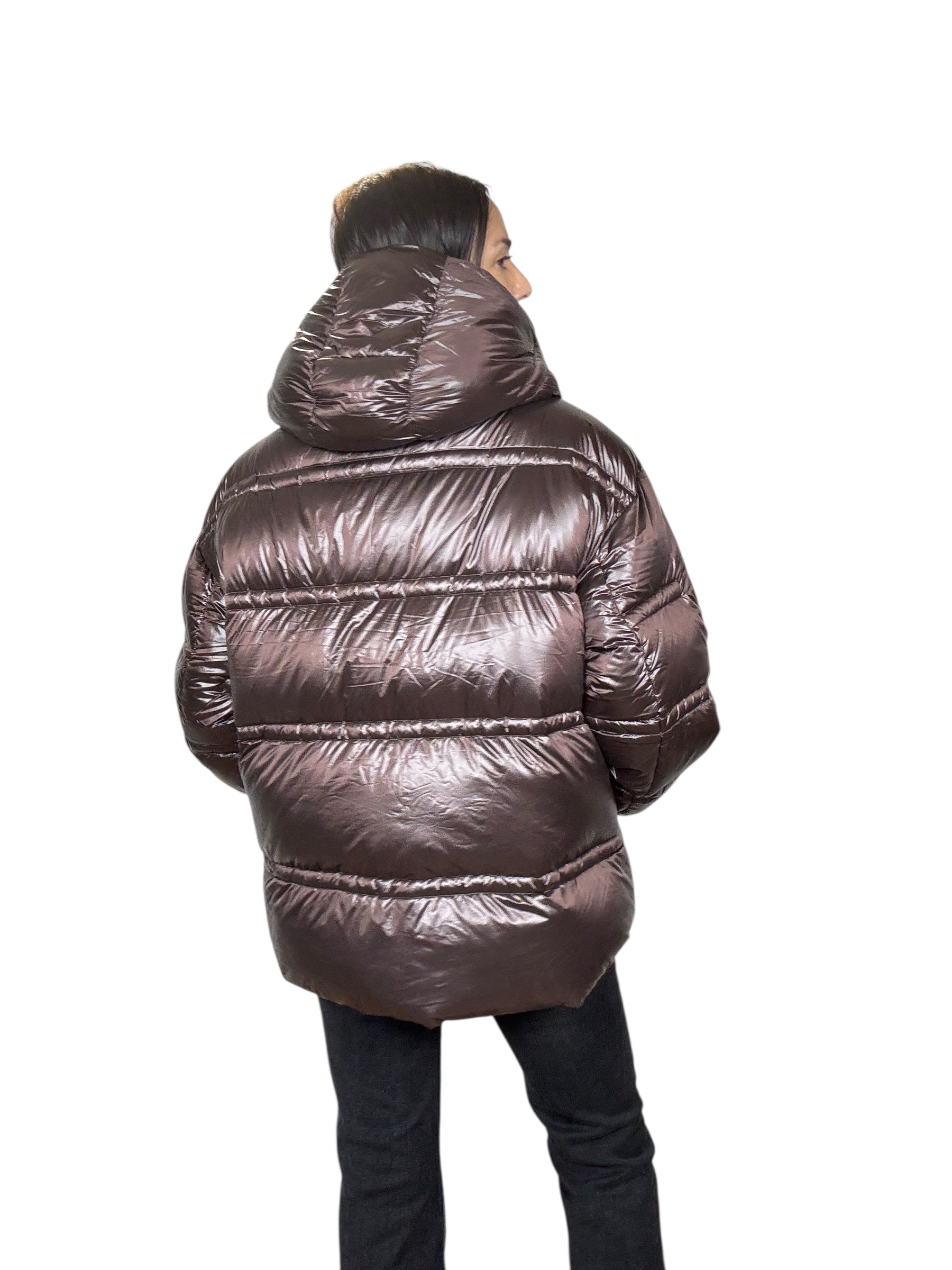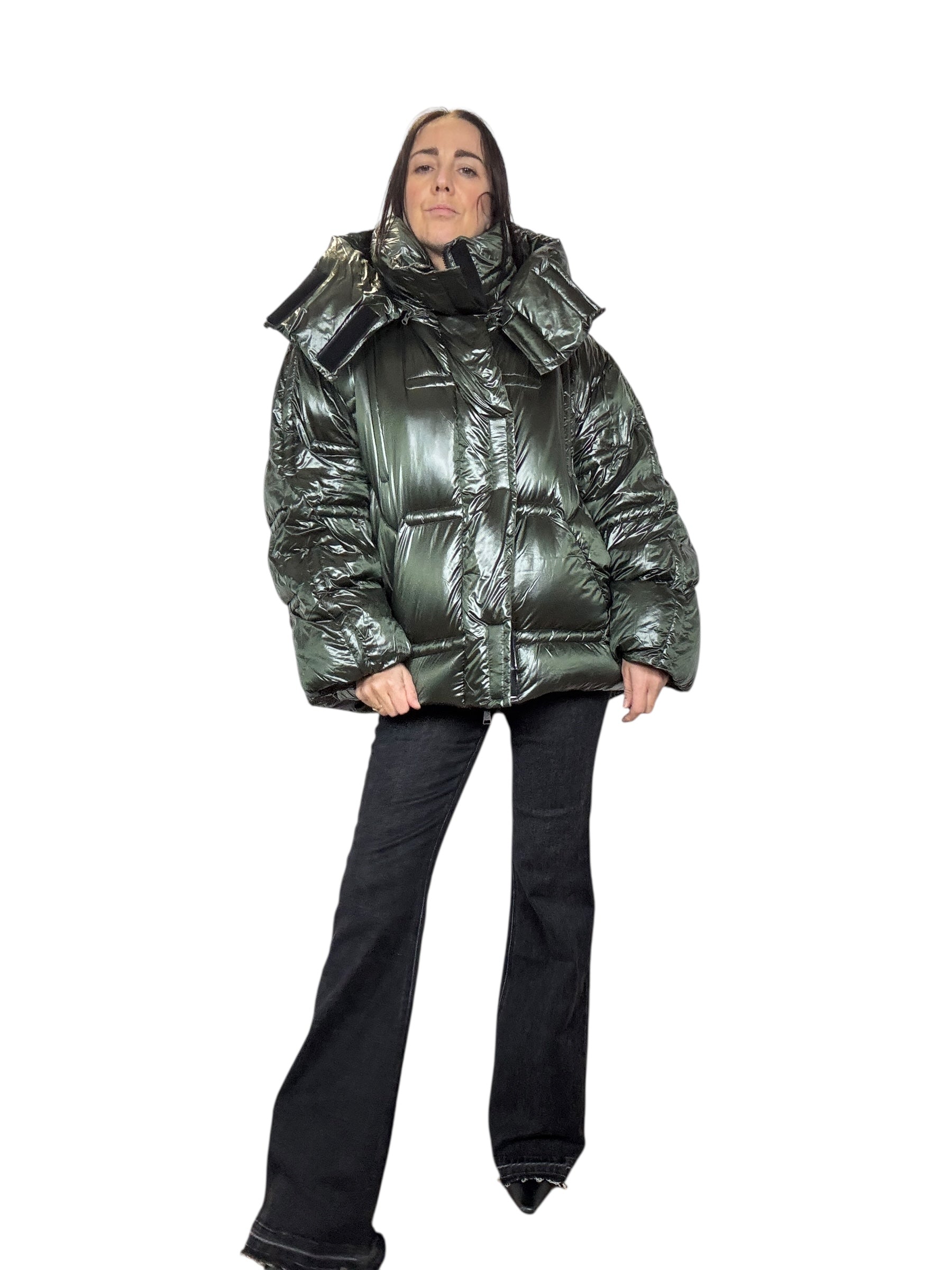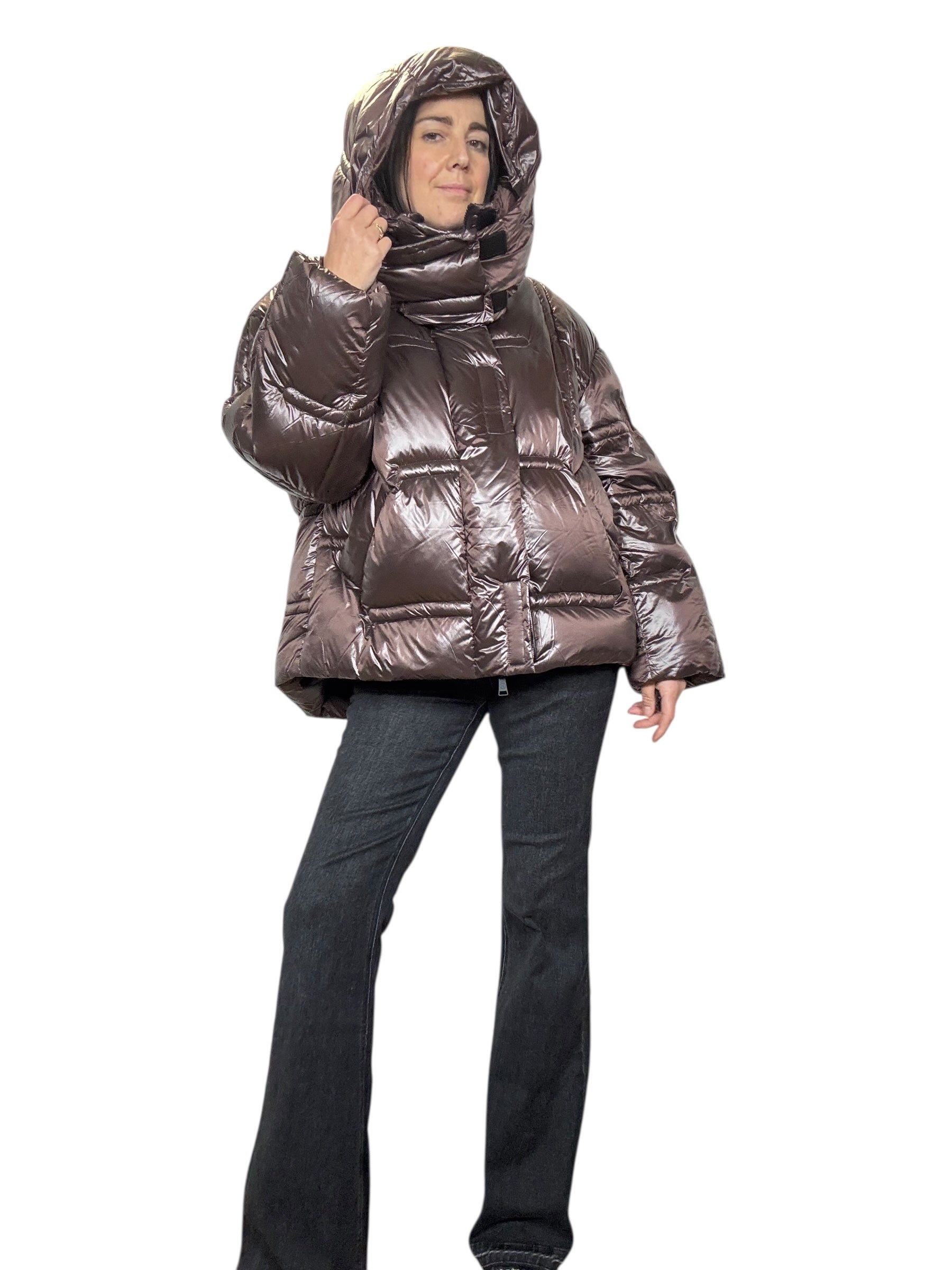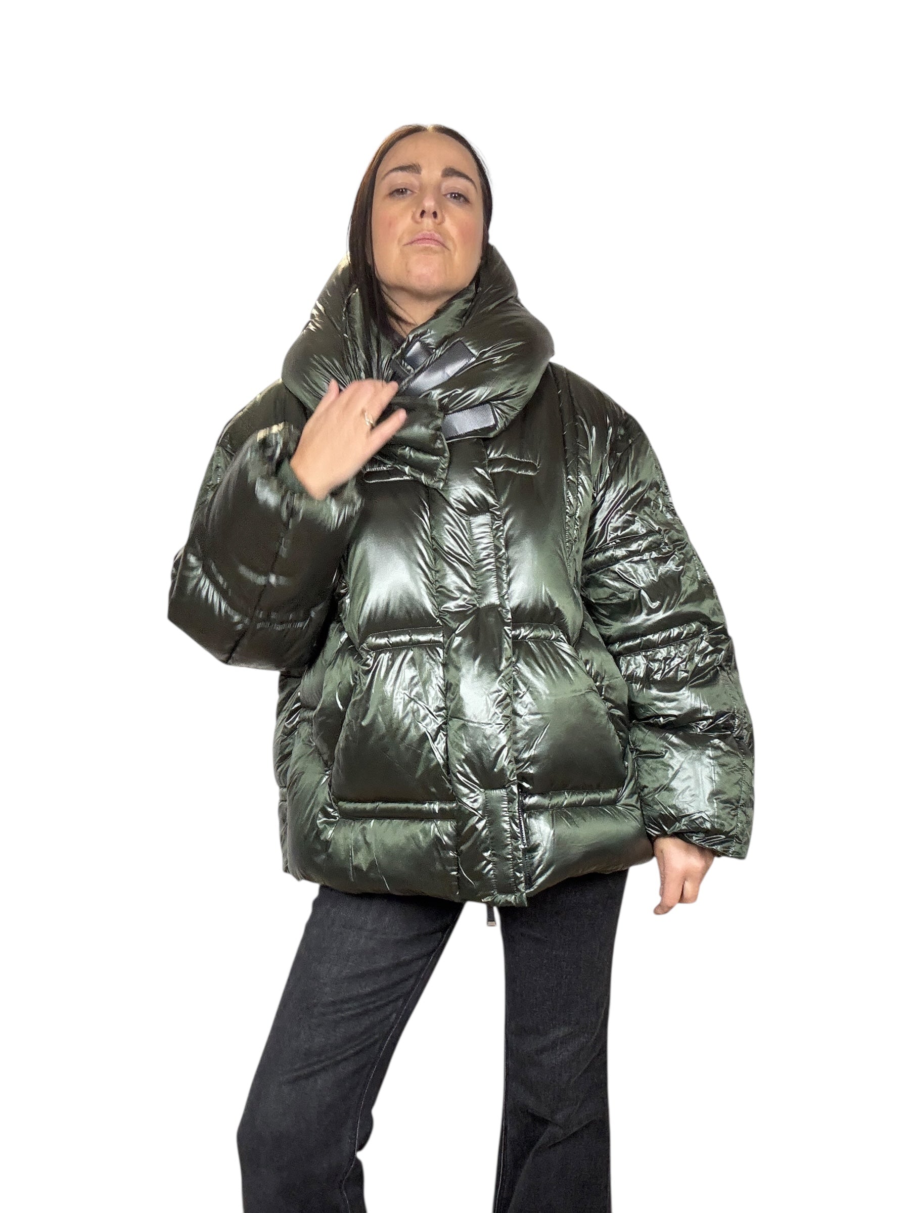 Piumino corto con collo a fascetta e cappuccio staccabile. Modello oversize con tasche laterali, chiusura con zip e strappo frontale. VESTIBILITA' OVERSIZE, VERA PIUMA