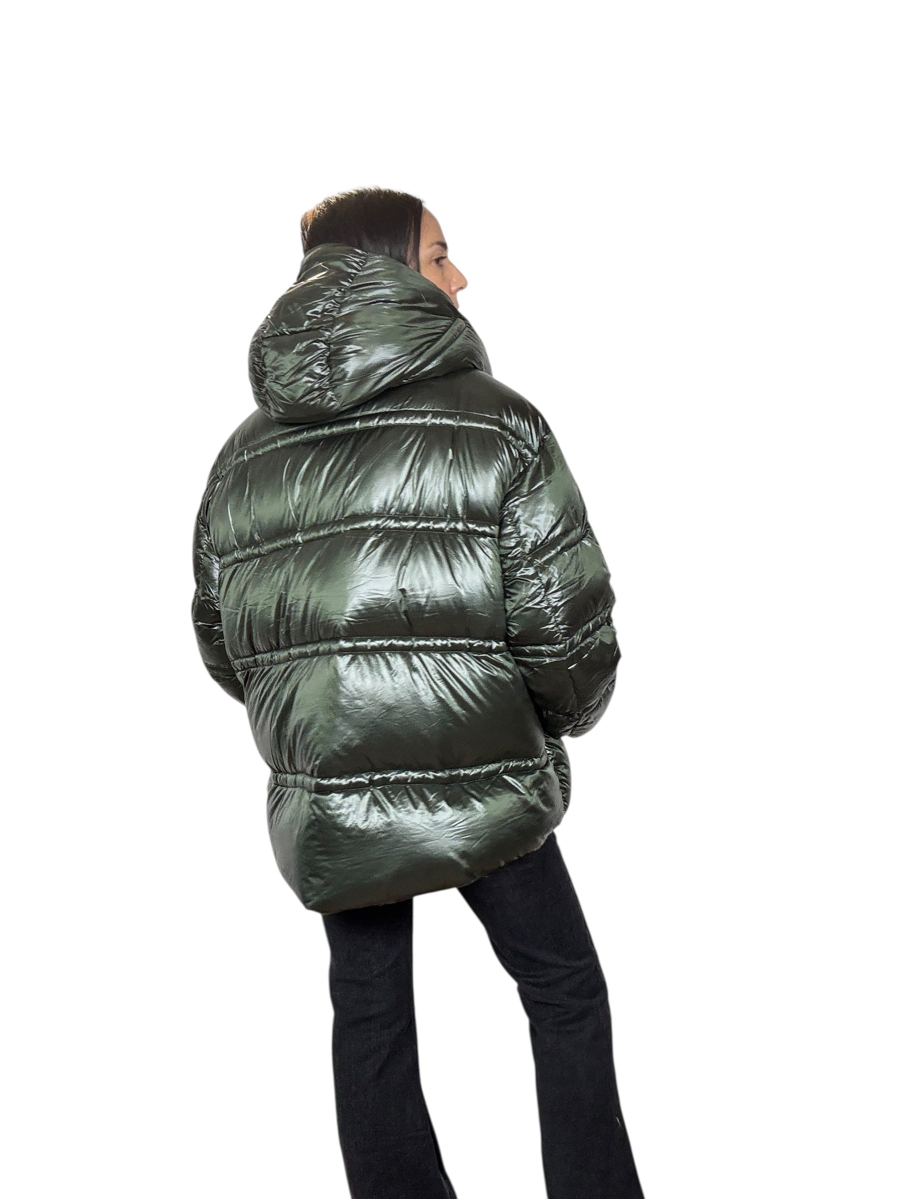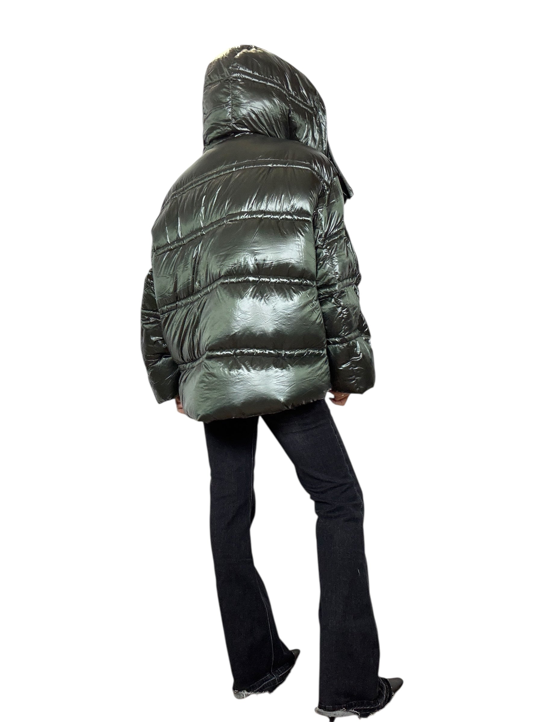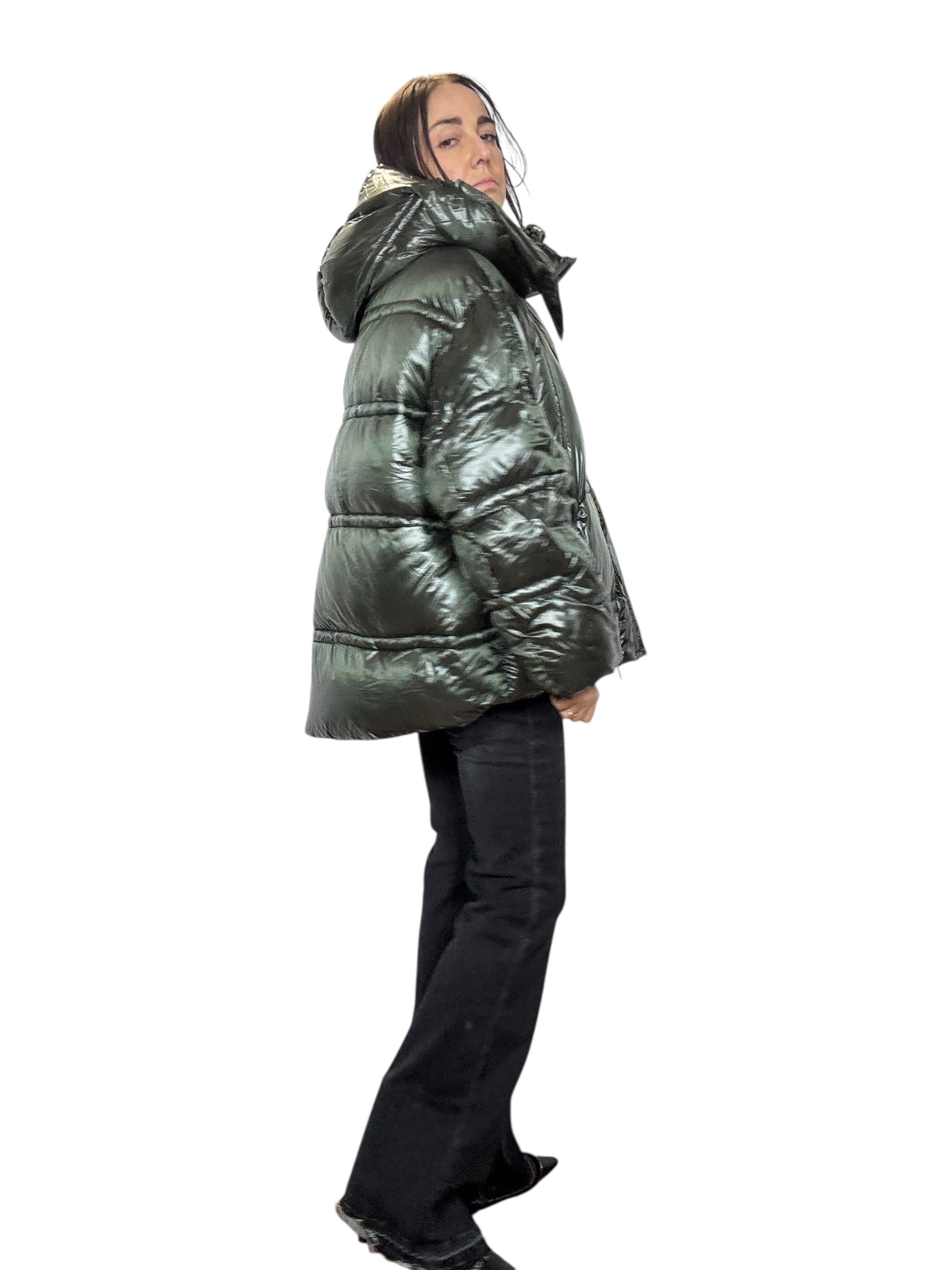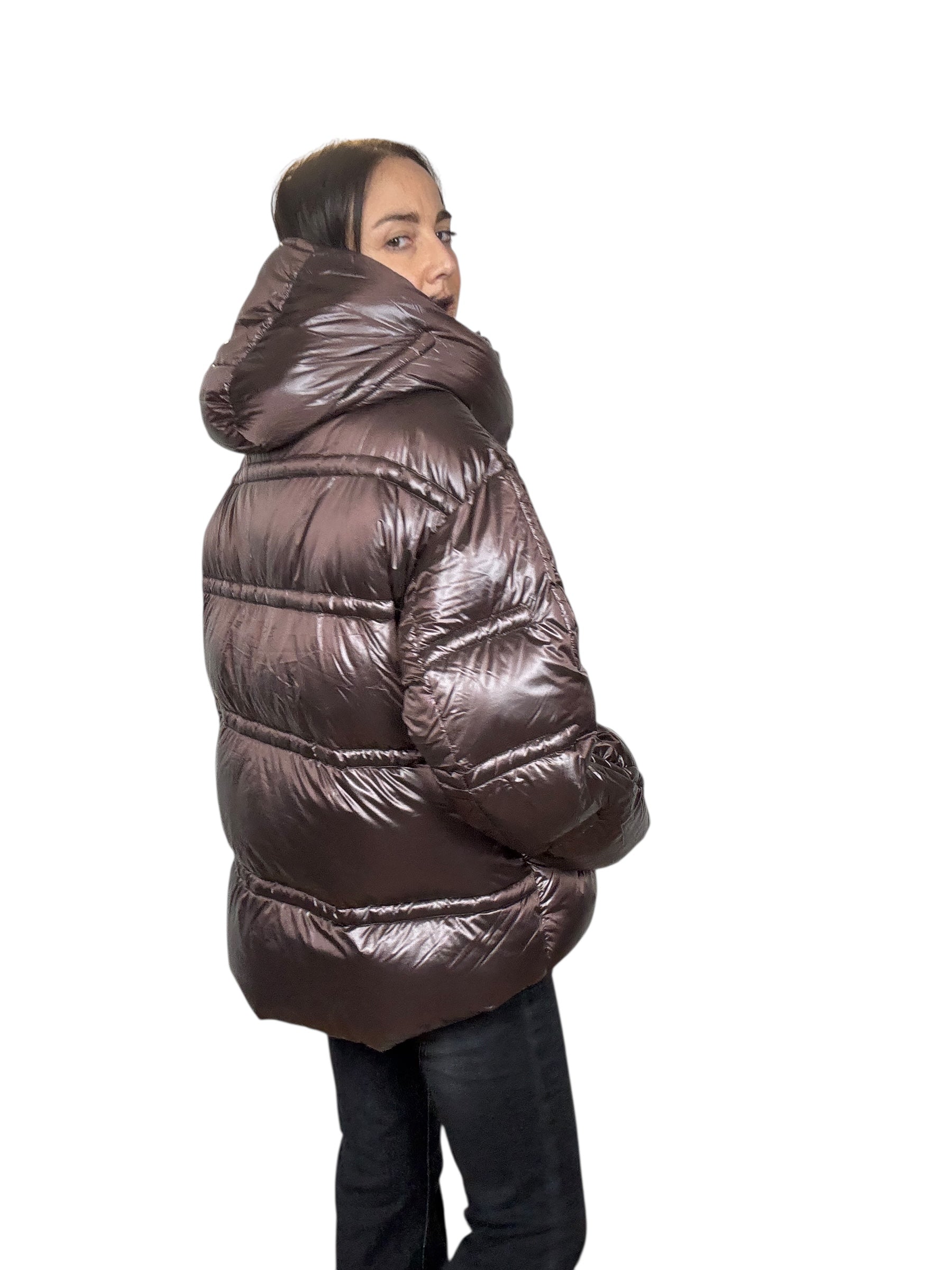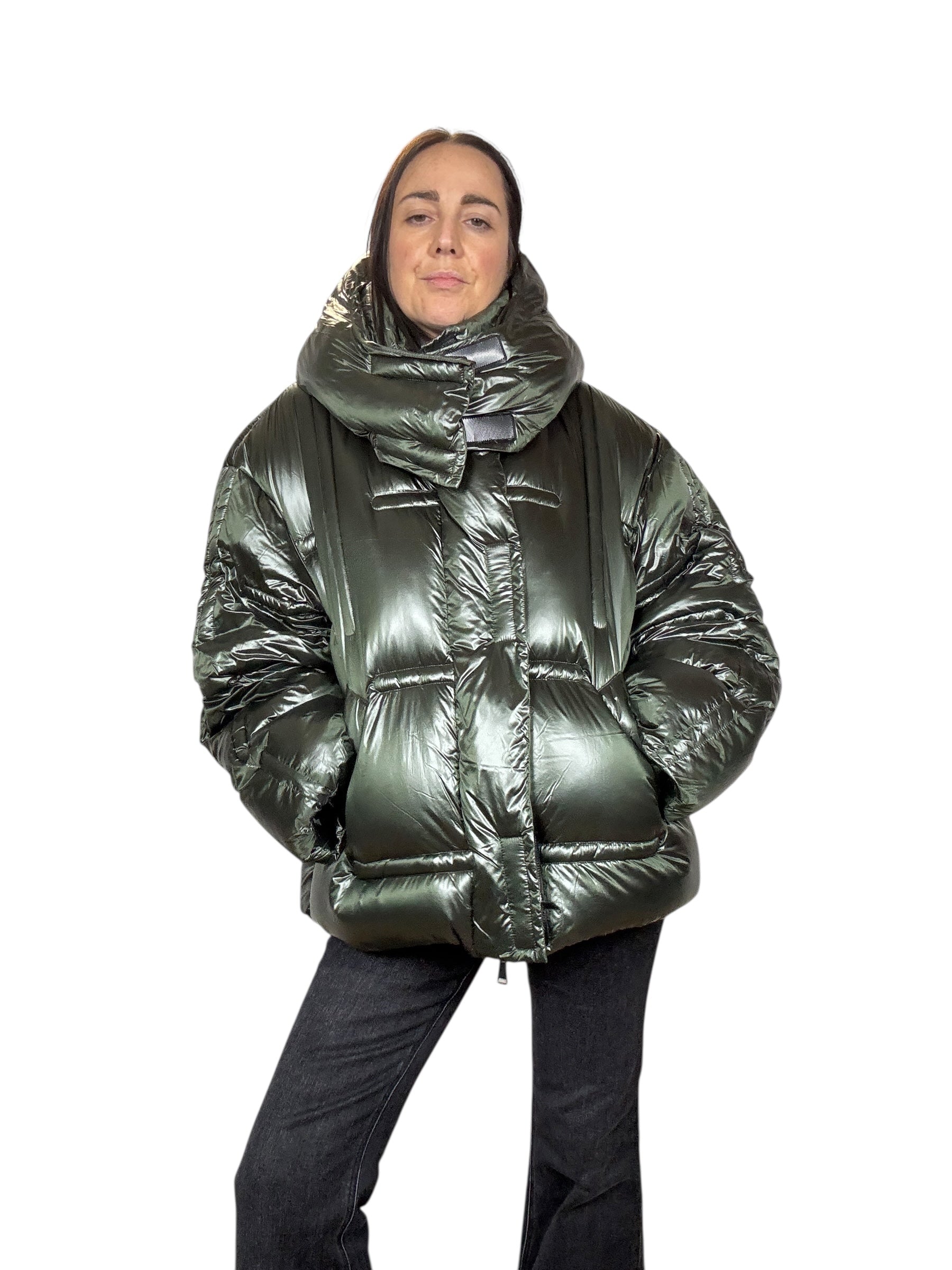 Piumino corto con collo a fascetta e cappuccio staccabile. Modello oversize con tasche laterali, chiusura con zip e strappo frontale. VESTIBILITA' OVERSIZE, VERA PIUMA