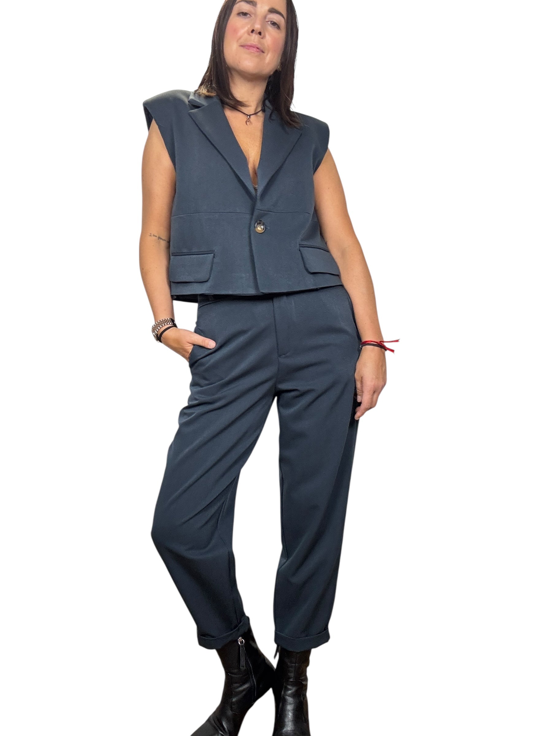 Gilet monopetto con finte tasche frontali e spacco sul retro, modello cropped corto e largo. Pantalone a vita con zip e bottone frontale. Modello a gamba asciutta con tasche laterali. Elasticizzato (tg in foto M veste poco)