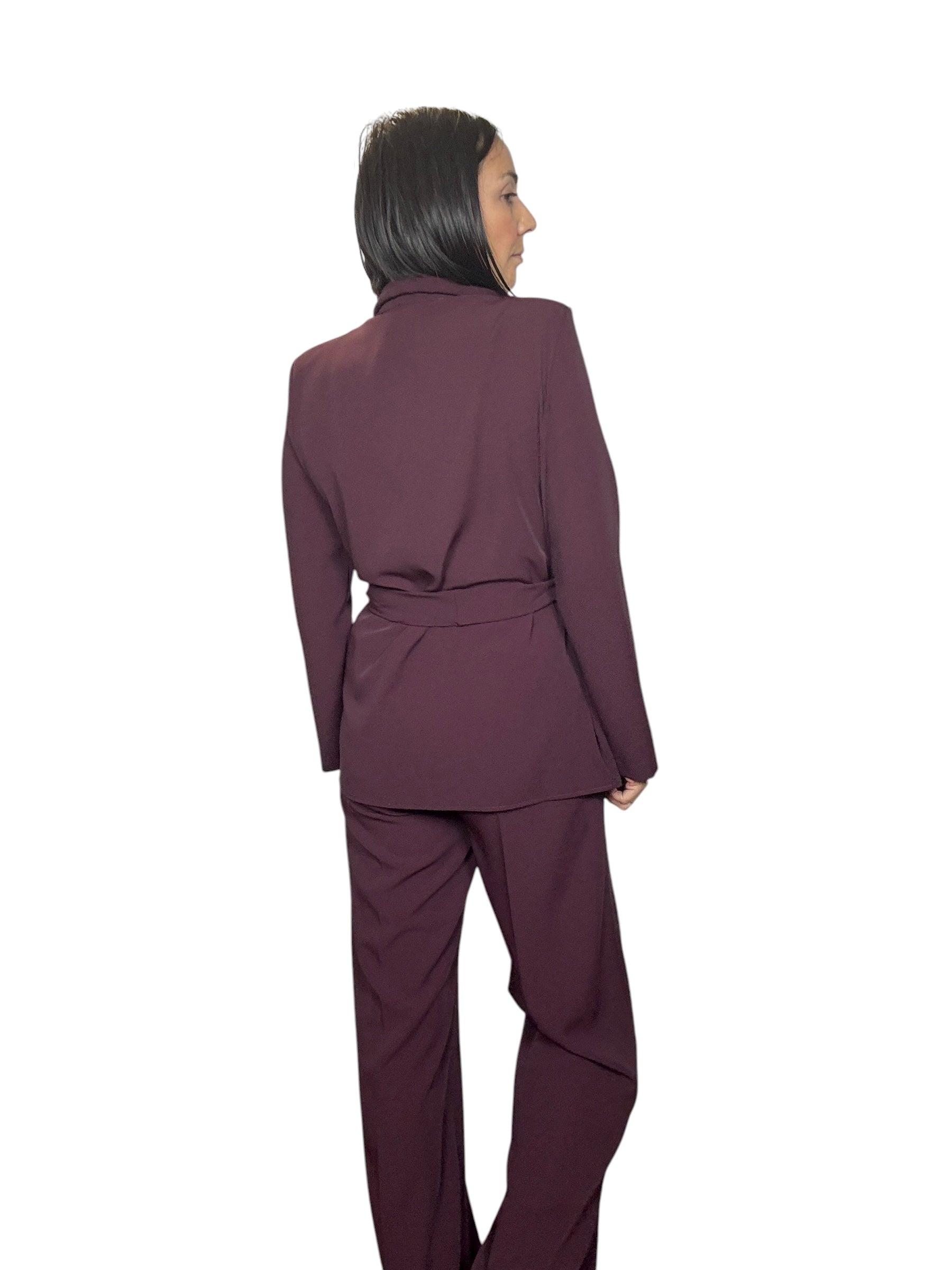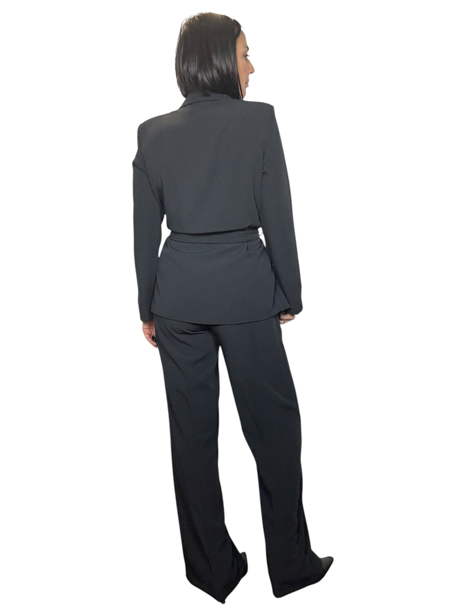 giacca sfoderata dal taglio dritto con spallina imbottita e cintura in vita, pantalone a vita alta con cinturone frontale e fascia elastica sul tretro. Modello a palazzo con tasche laterali. Tessuto fluido che scivola senza segnare ( tg in foto S)