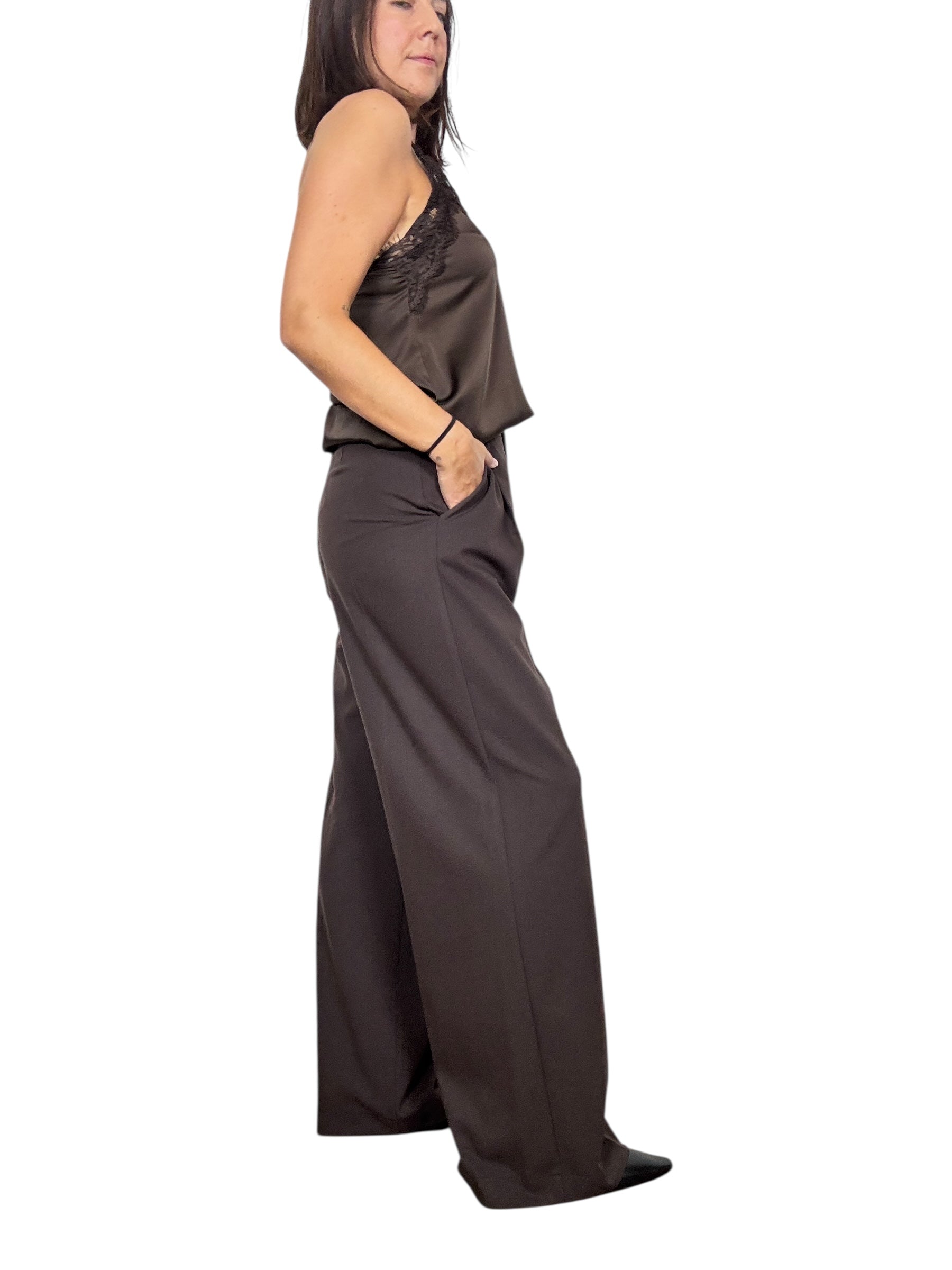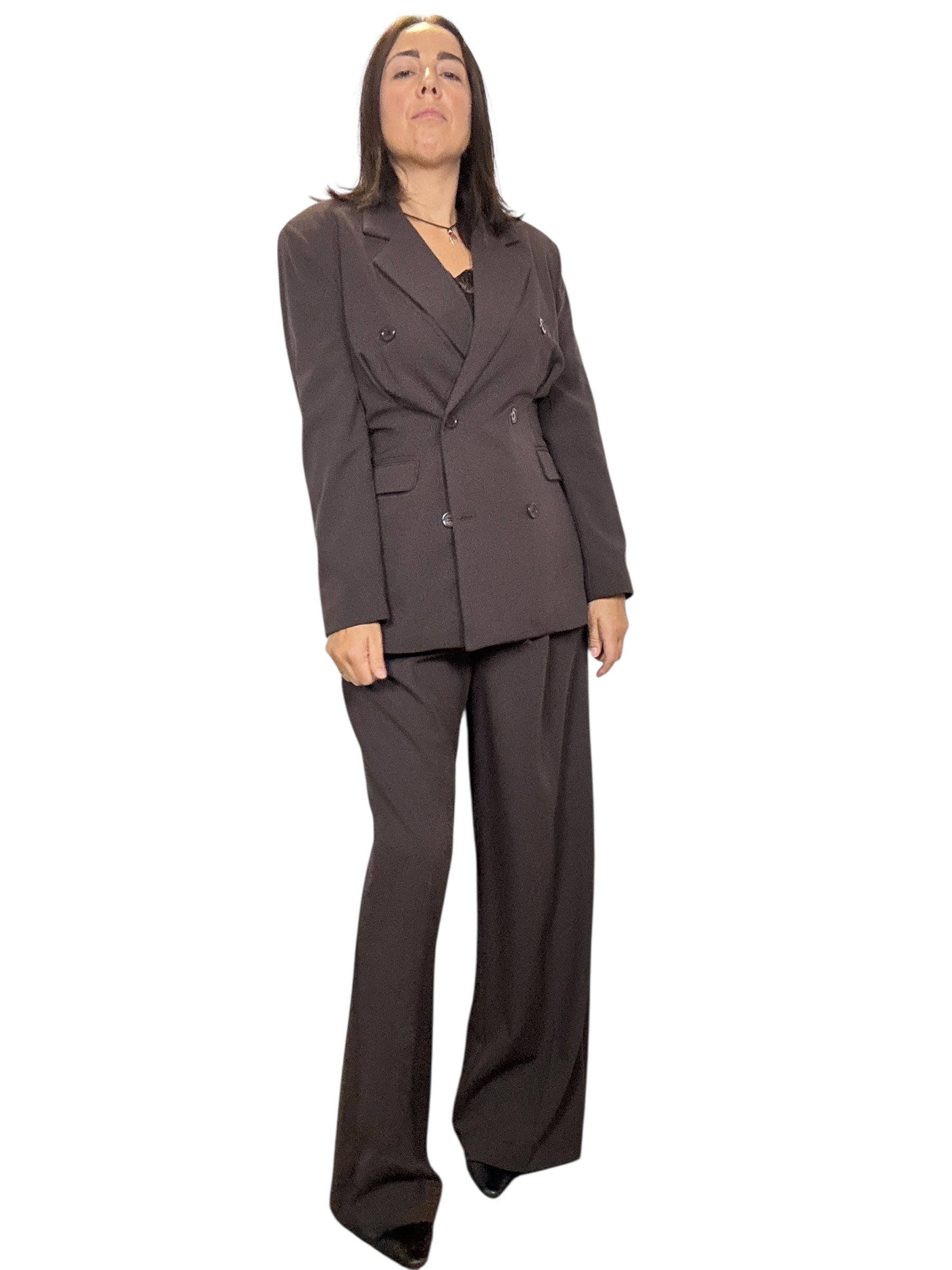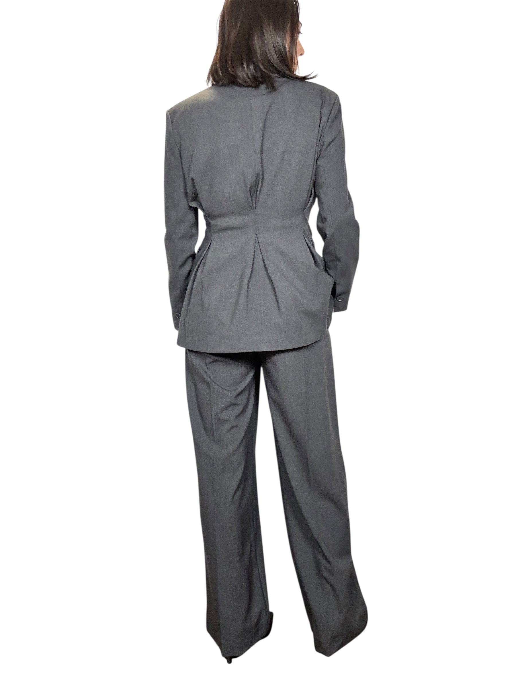 Giacca doppiopetto foderata con finte tasche con pattina e pinces dulla schiena. Modello sfiancatissimo ed asciutto sulla figura. Pantalone a vita alta con cinturone e tasche laterali, modello con pinces frontali